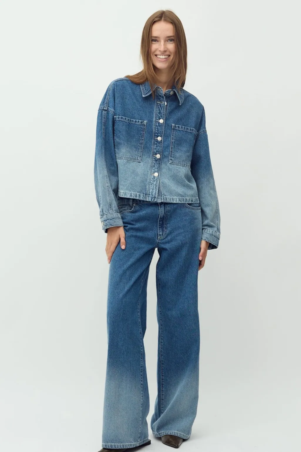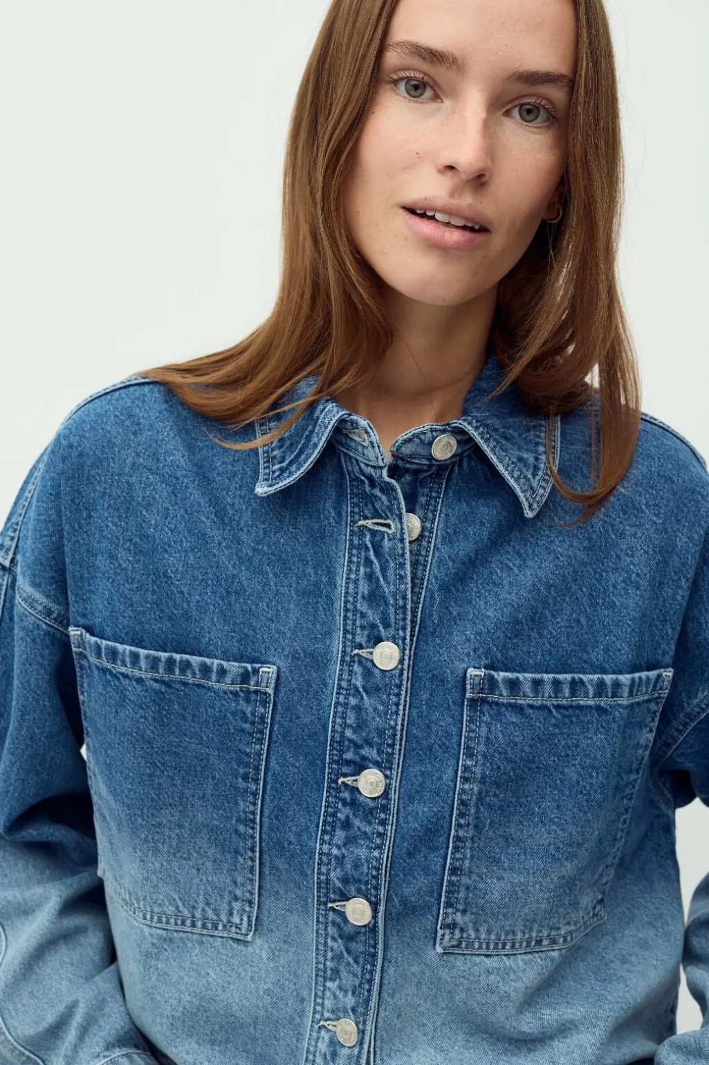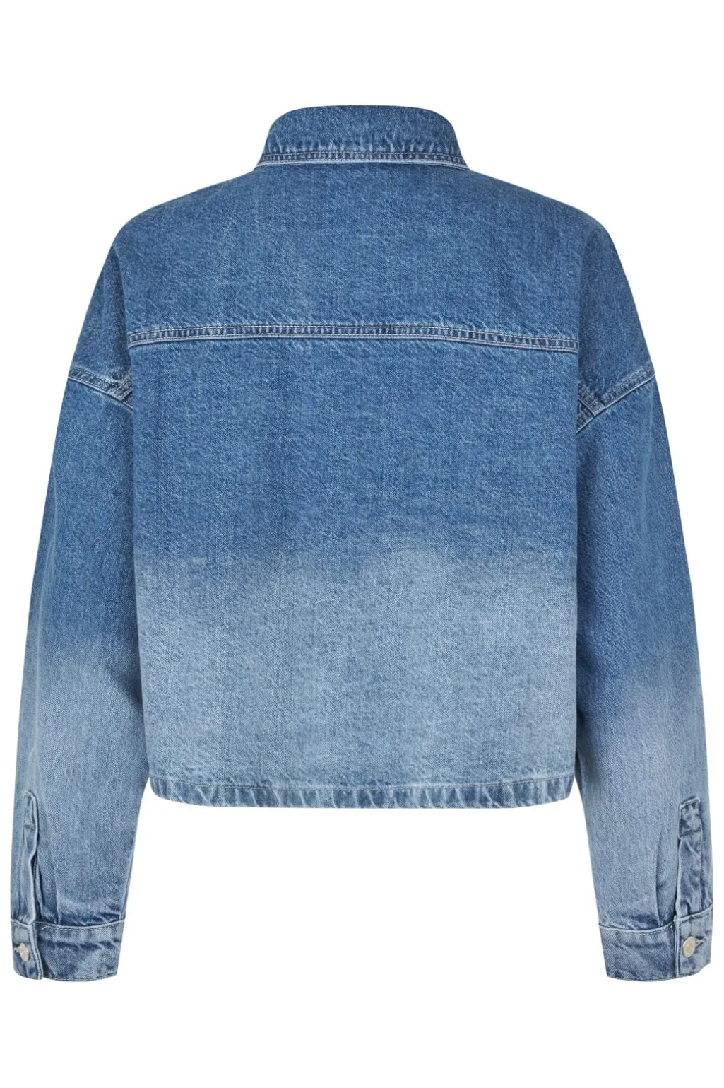 Denimjakke fra MbyM i en falmet denimvask. Jakken har skjortekrave, lange ærmer og knapper foran. To store lommer på forsiden giver jakken et klassisk denimlook.