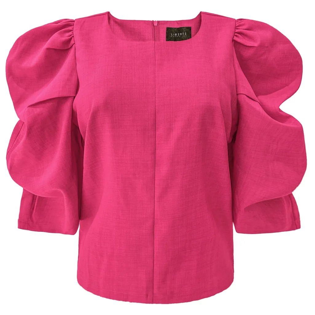 Bluse fra Liberte i stærk pink. Blusen har puffede ærmer og en rund halsudskæring med lynlås.