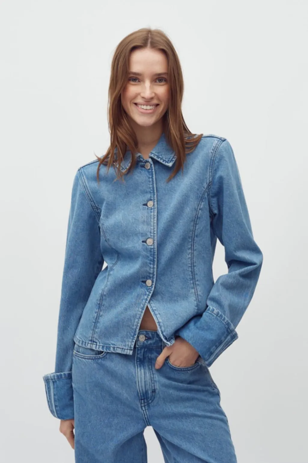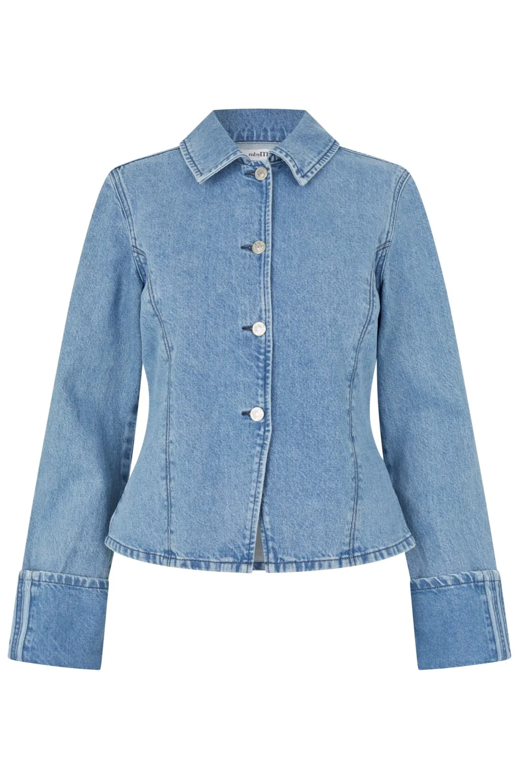 Denimjakke fra MbyM i en lys blå vask. Jakken har en slim fit-pasform med skjortekrave og knapper hele vejen ned. De dekorative syninger giver jakken et gennemført udtryk.