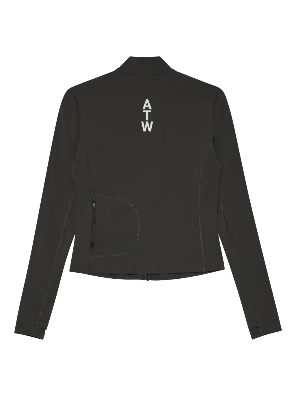 En zip-jakke fra Halo i mørk grøn farve. Jakken har lange ærmer, høj krave og lynlås hele vejen op.