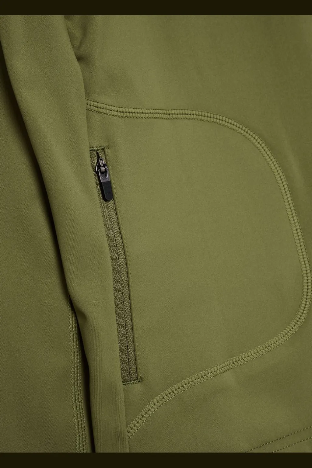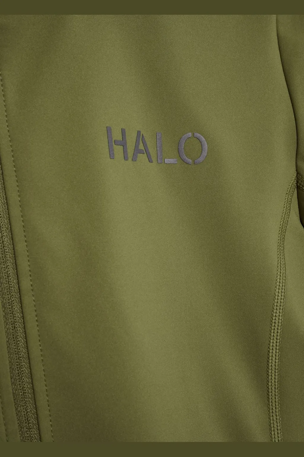 Zip-jakke fra Halo i olivengrøn. Jakken har refleksprint med HALO-logoet foran og ATW-logoet bagpå samt dekorative syninger.