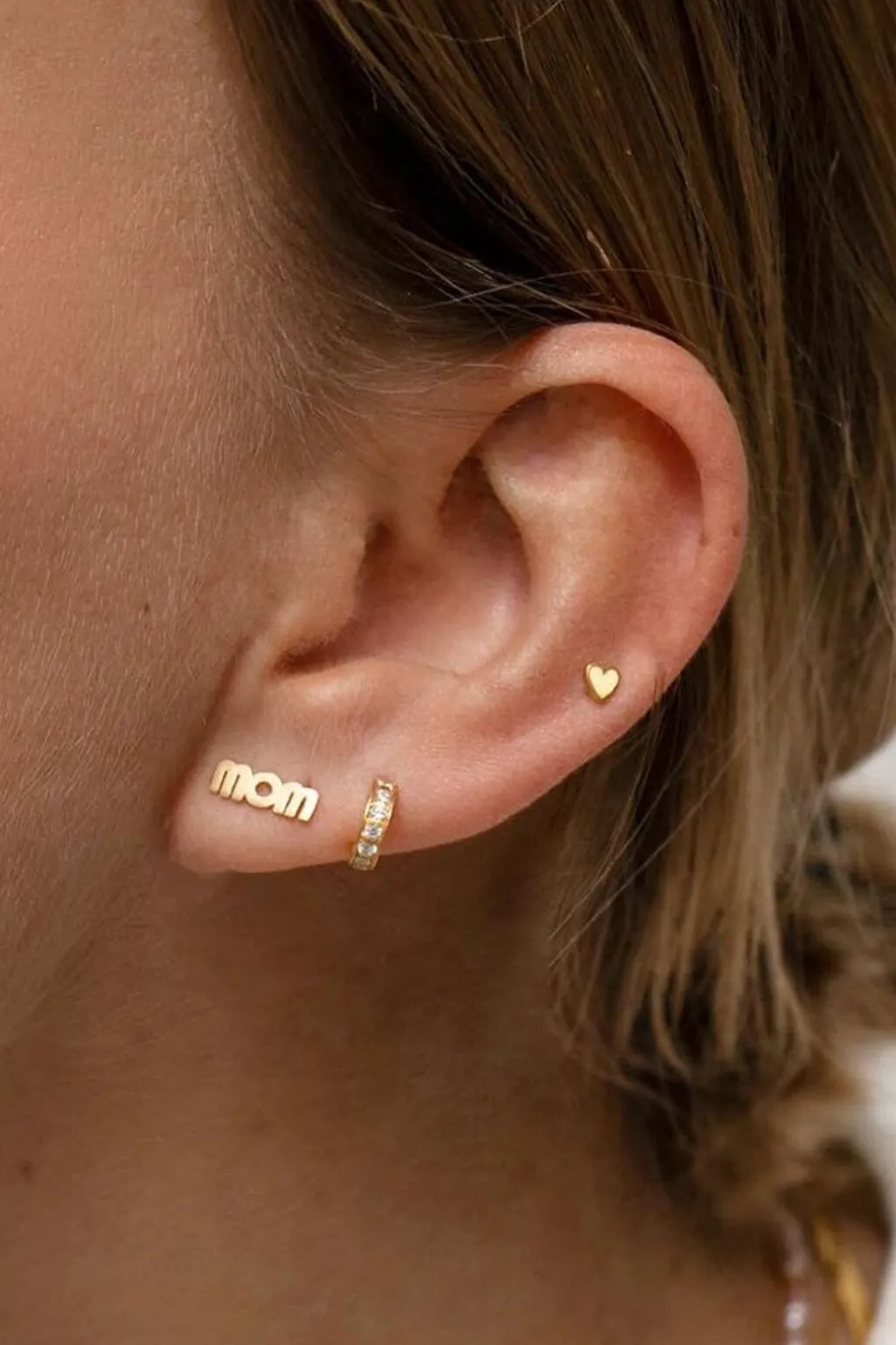 Fin ørestik med ordet MOM og WOW, afhængigt af hvilken vej du vælger at bære øreringen.