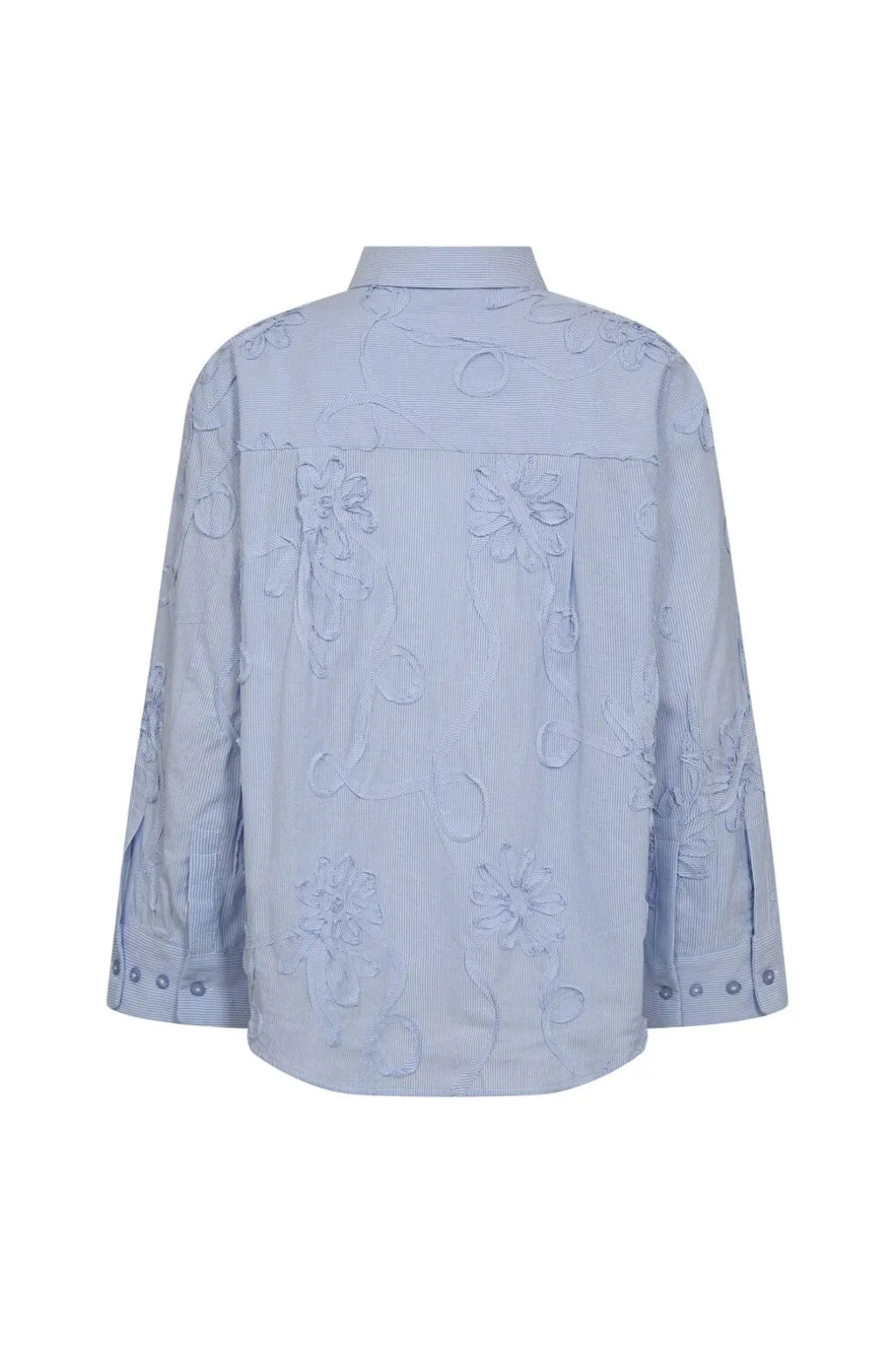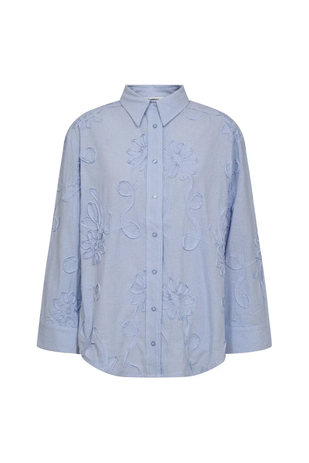 Lyseblå skjorte fra Co´Couture med stribede mønstre og blomsterbroderi. Skjorten har en løs pasform og 3/4-lange ærmer.