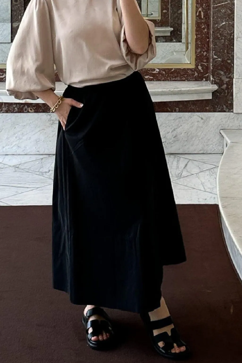 Sort poplin-nederdel fra Neo Noir med høj elastik i taljen. Nederdelen har praktiske lommer i siden og går til læggene. Den er lavet af let bomulds-poplin med stretch.