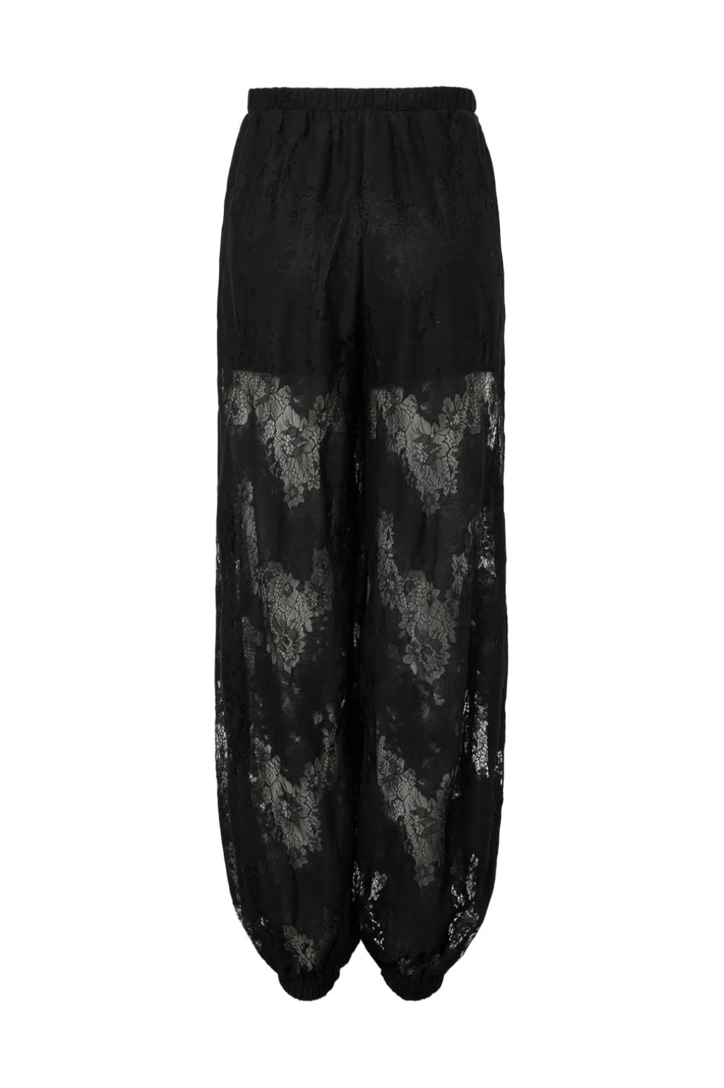 Sorte ballonbukser fra YAS med blomsterblondemønster over hele bukserne. Bukserne er egnede til festlige lejligheder med deres løse pasform og ankel-længde.