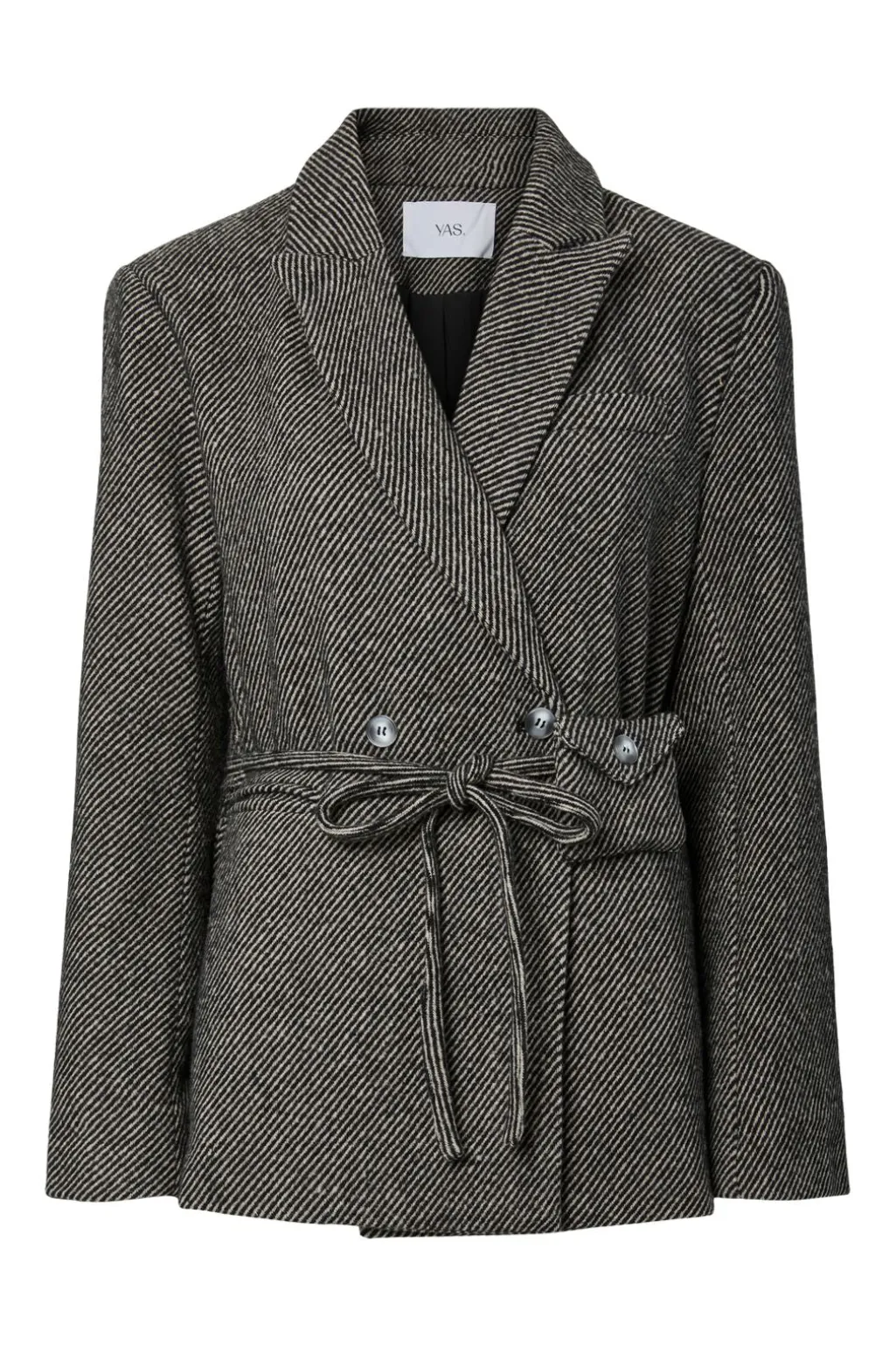 Sort blazer fra Y. A.S med sildebensmønster. Blazeren har dobbeltknappet design med fire knapper og bindebælte i taljen. V-halsudskæringen og de lange ærmer giver blazeren et klassisk snit.