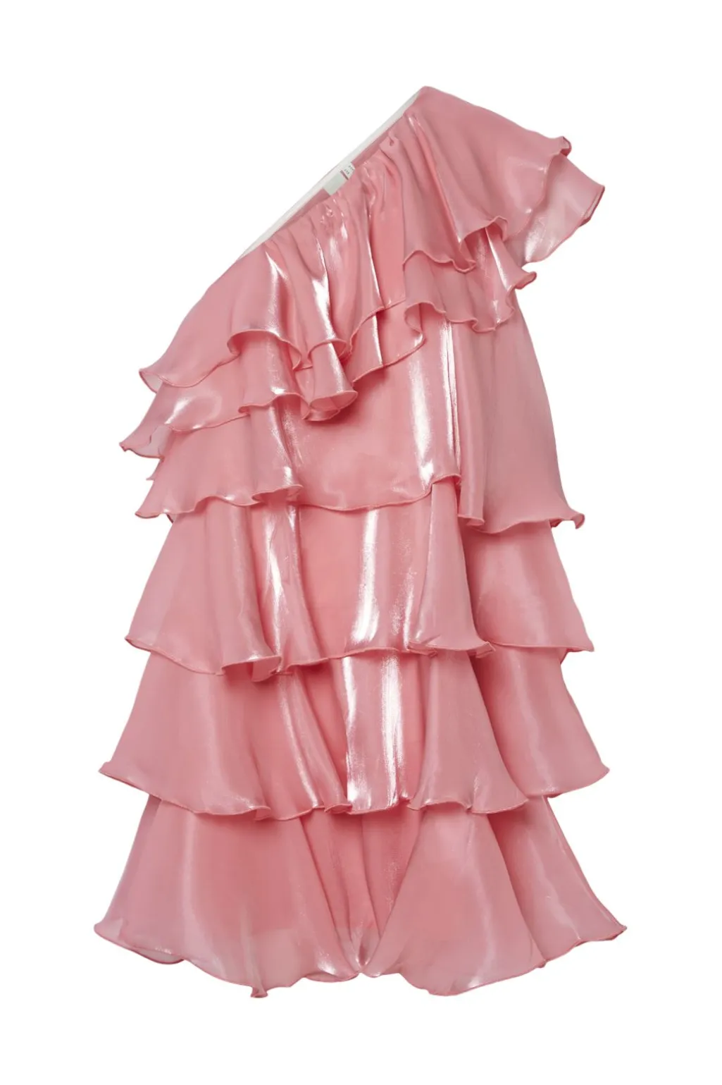 Kort kjole fra Y. A.S i skinnende bubblegum-pink. Den har en one-shoulder udskæring og er dækket af lagdelte flæser fra top til bund. Stoffet har en let metallisk finish.