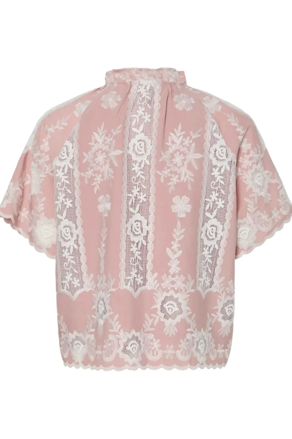 Rosa skjorte fra Y. A.S med hvidt broderi og blondedetaljer. Skjorten har kinakrave, knaplukning foran og korte ærmer med bølgekant.