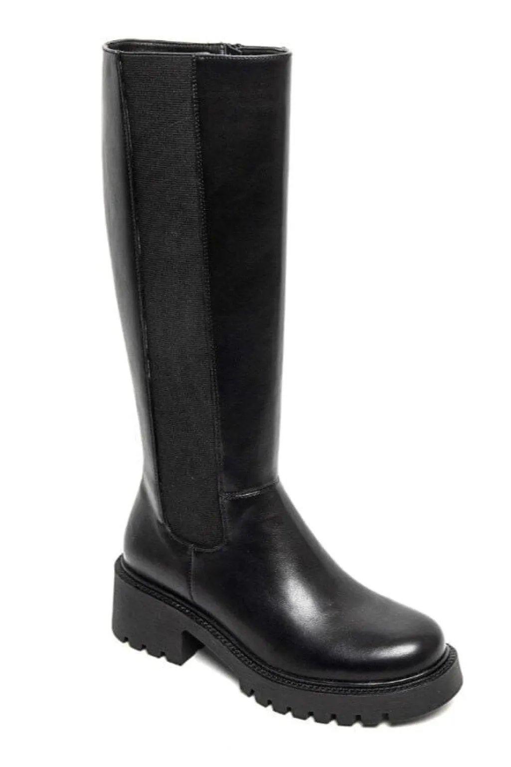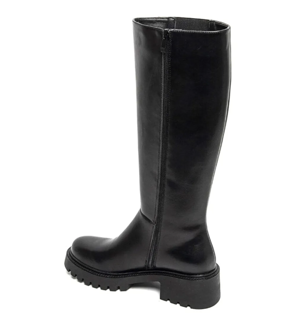 Sorte støvler fra Bloom, lavet af syntetisk materiale. Støvlerne har et højt skaft og en chunky sål med et markant mønster.