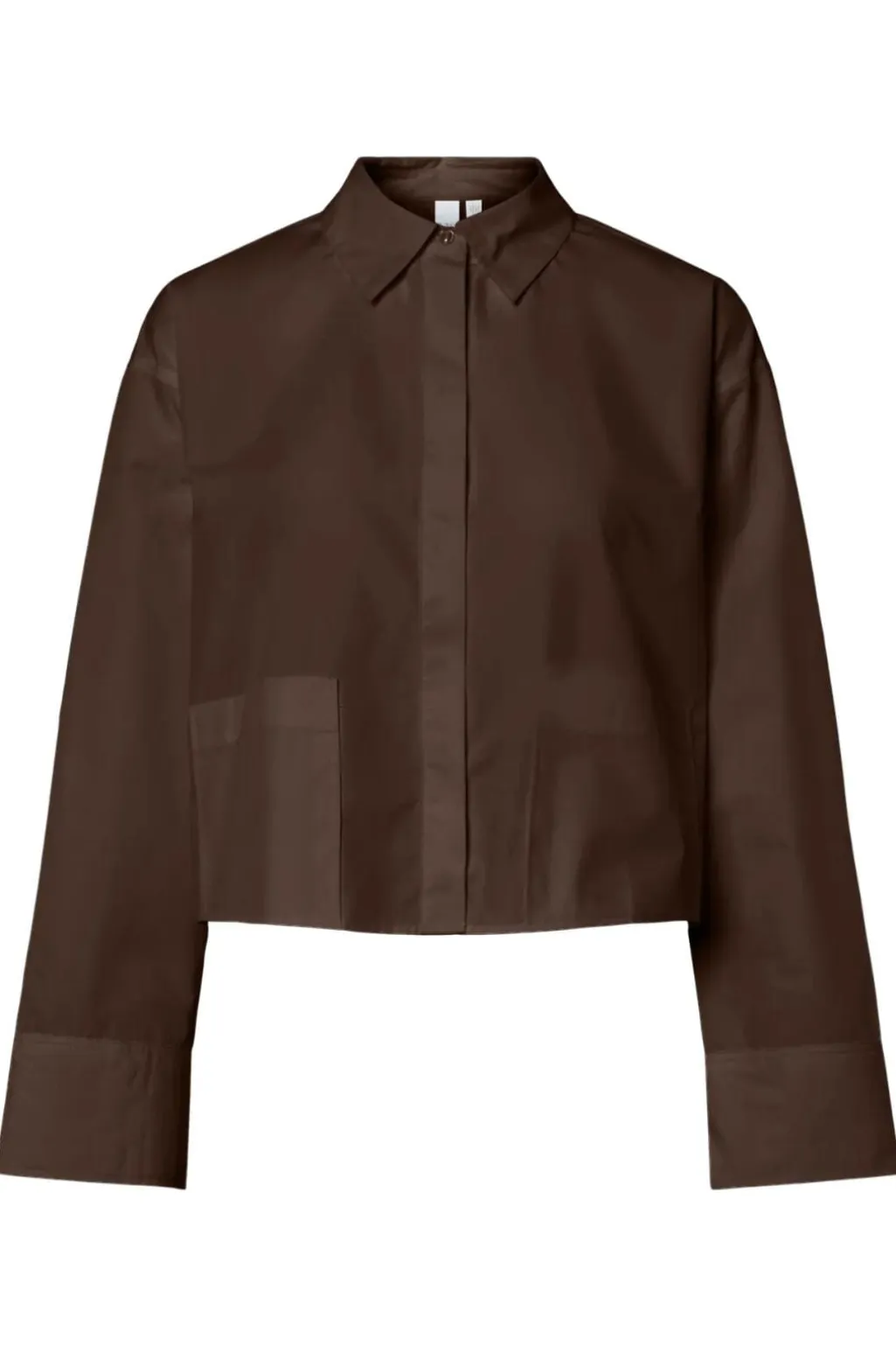 Kort skjorte fra Y. A.S i chokoladebrun. Skjorten har lodrette plisseringer på ryggen og en klassisk skjortekrave.