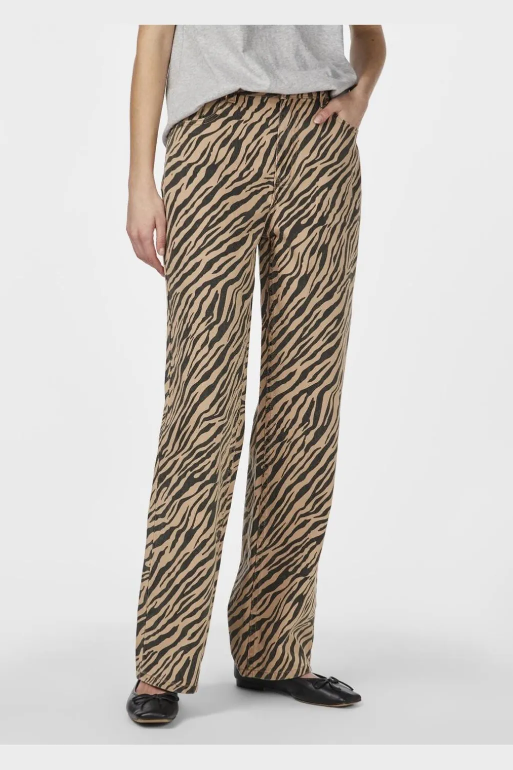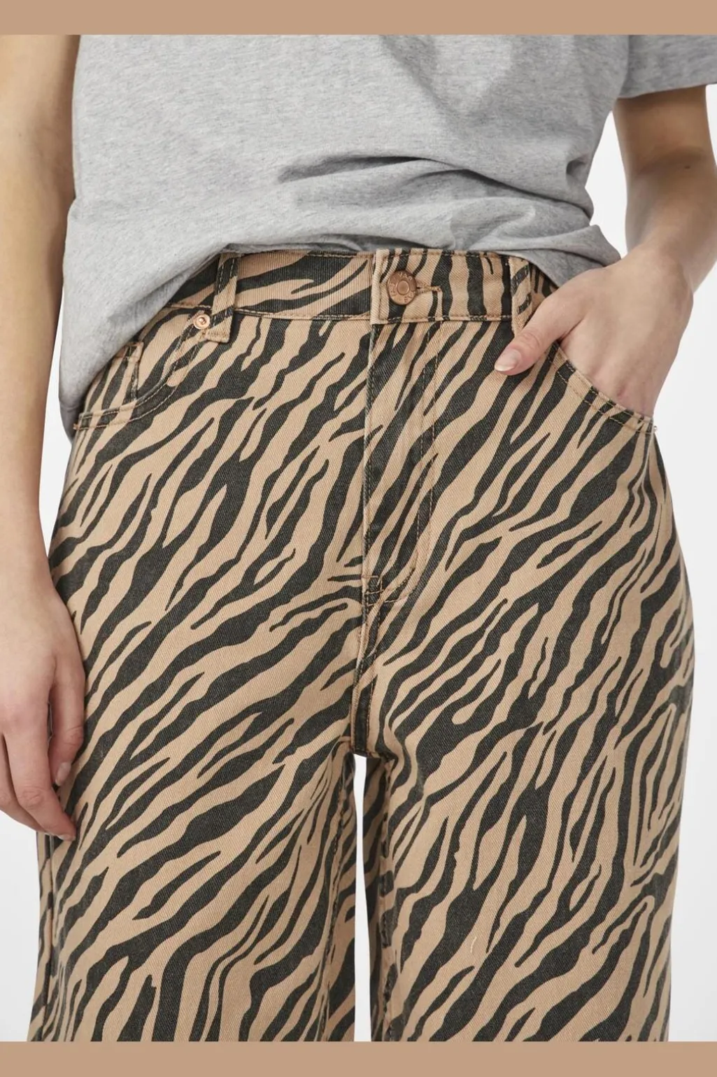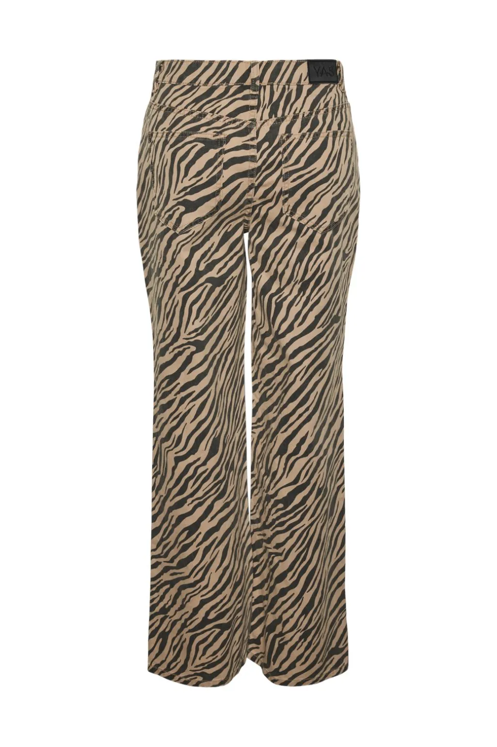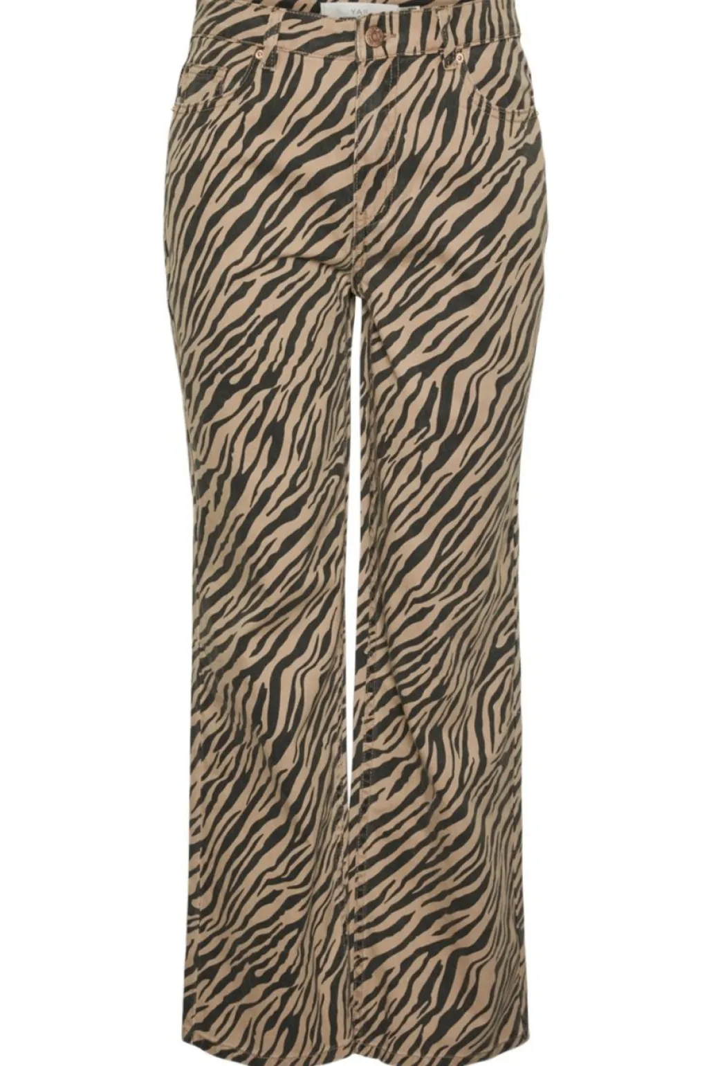 Jeans fra Y. A.S med tigerstribet mønster i beige og sort. Bukserne har en høj talje og gulvlængde med regular pasform.