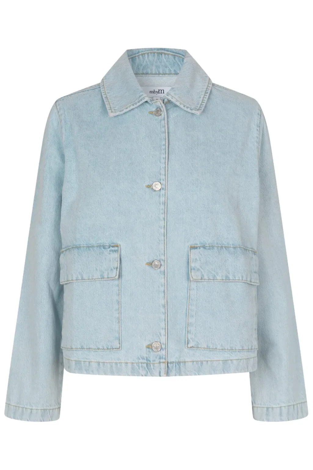 Denimjakke fra MbyM i en lys blå vask. Den har skjortekrave og knaplukning foran. To store frontlommer giver jakken et praktisk og casual udtryk.