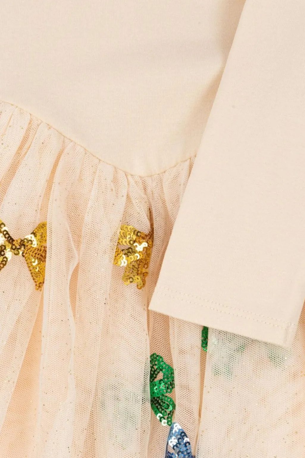 Kjole fra Konges Sløjd i creme og hvid med en overdel i bomuld og en nederdel med farverige pailletter formet som sløjfer.