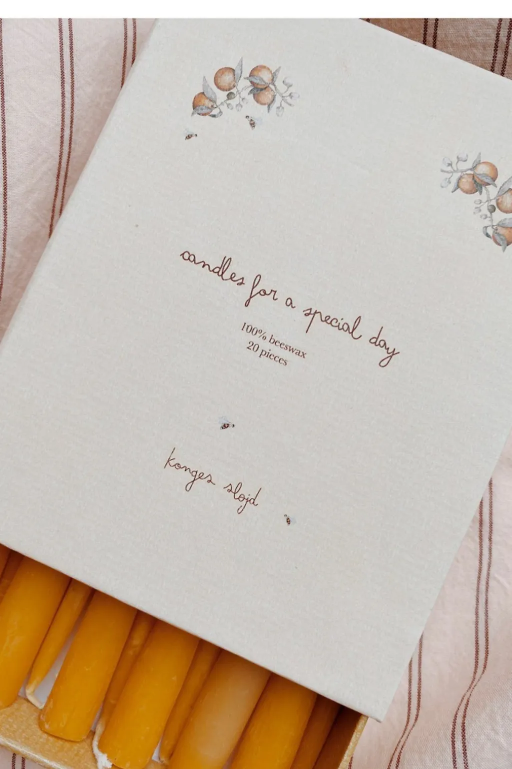 Gule fødselsdagslys fra Konges Sløjd i en tændstikæske. Lysene er lavet af bivoks og kommer i en naturfarvet udgave med en brændetid på op til 2 timer.