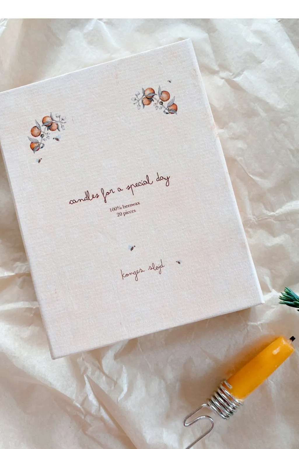 Lysene ligger beskyttet i en tændstikæske med fine illustrationer. Æsken er praktisk til opbevaring og nem at have med sig.