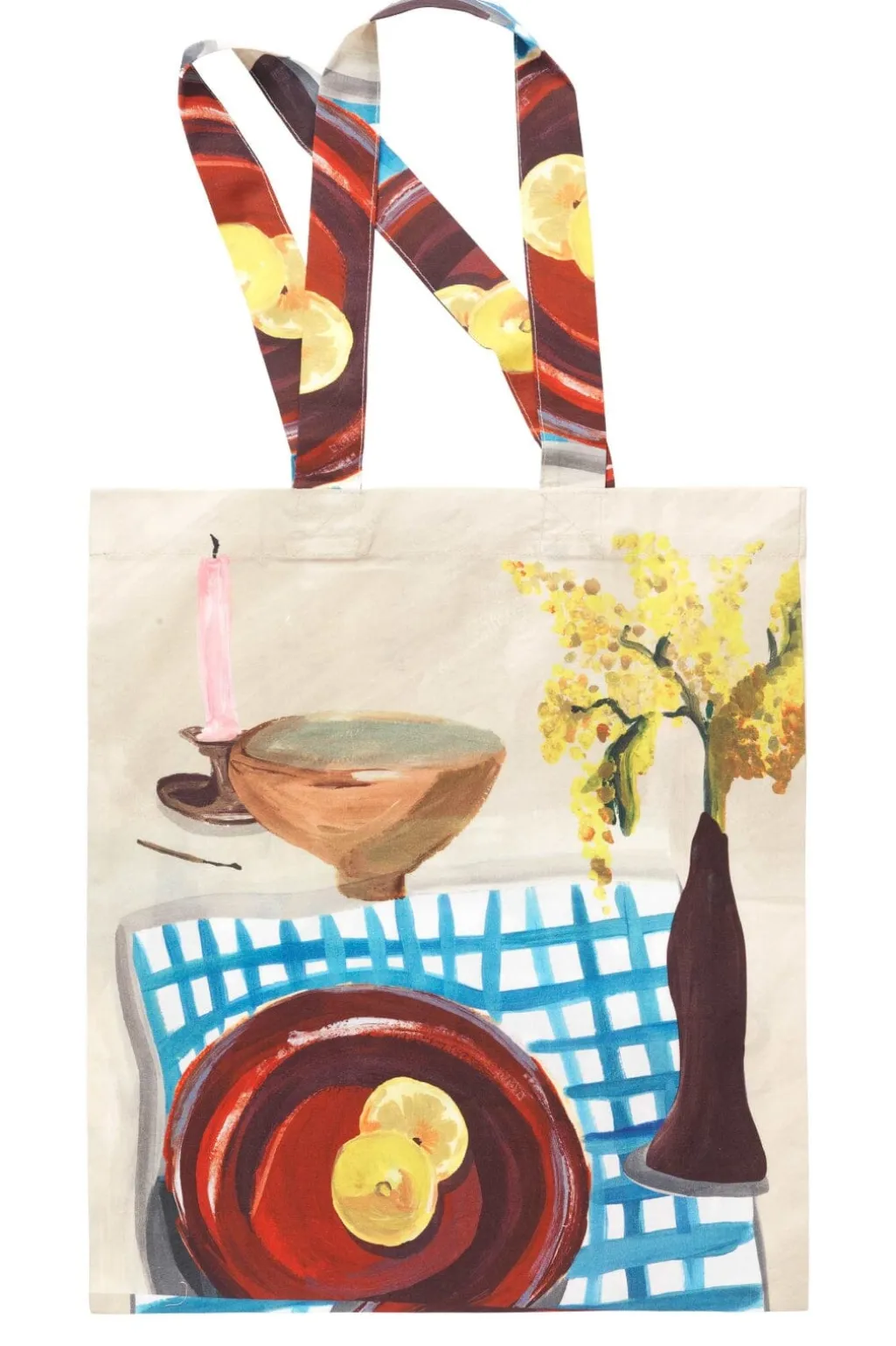 Stine Goya tote bag i økologisk bomuld med et malet stillebenmotiv. Tasken har et kunstnerisk print med citroner på en tallerken, et lys og gule blomster.