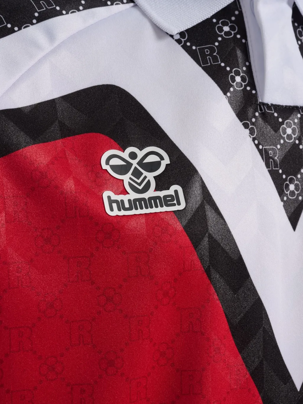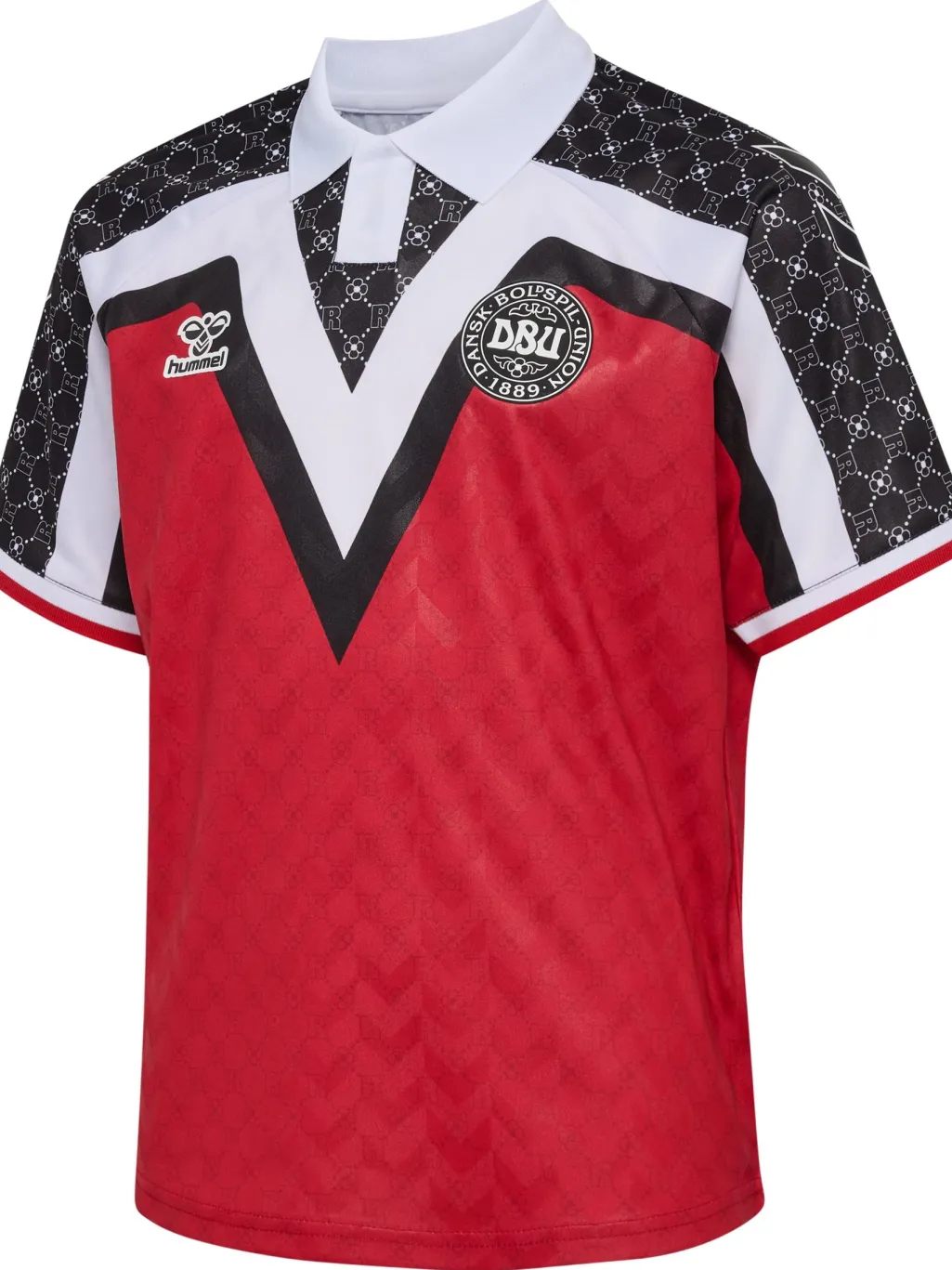 Rød fodboldtrøje fra DBU x Rotate med V-formet mønster og hvid polokrave. Trøjen har DBU-logo på brystet og Rotate-branding på ryggen.