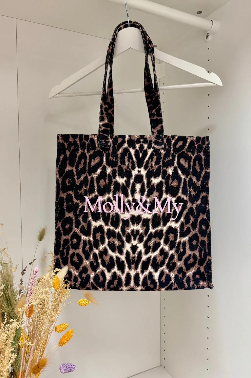 Tote bag fra Mellow Moon med leopardmønster i sort, beige og brune nuancer. Det pink Molly&My-logo på forsiden skaber en fin kontrast til mønstret.