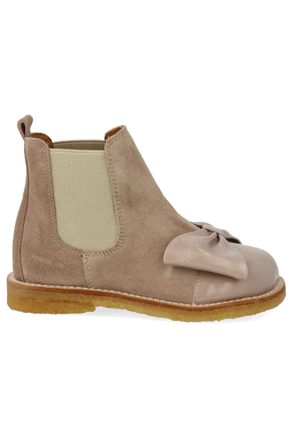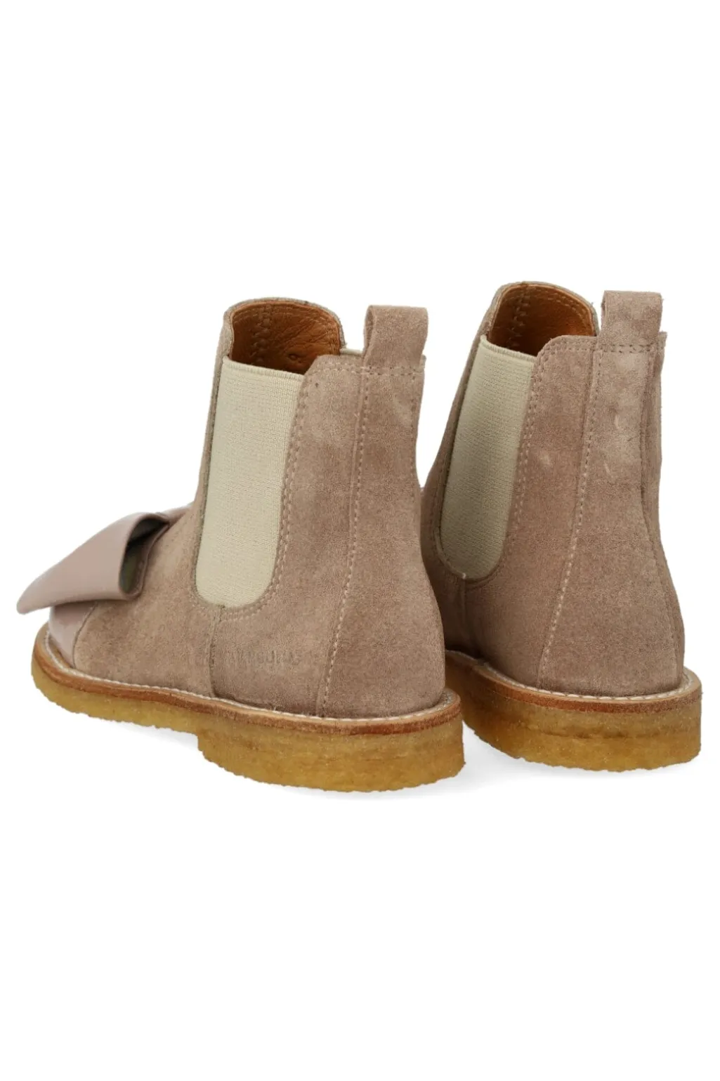 Chelsea-støvler fra Angulus i lyserødt læder med en skinnende sløjfe foran. Støvlerne er designet i Danmark og håndlavet i Portugal til formelle lejligheder.