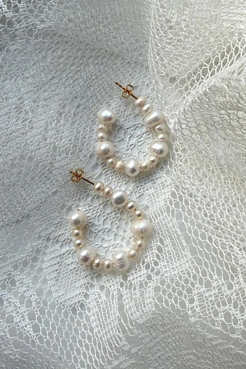 Hoop-øreringe fra Molly&My Jewellery med hvide ferskvandsperler i forskellige størrelser og former. Hoops er lavet af skaller med guldfarvede stifter.