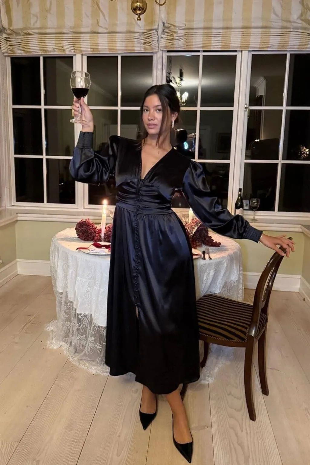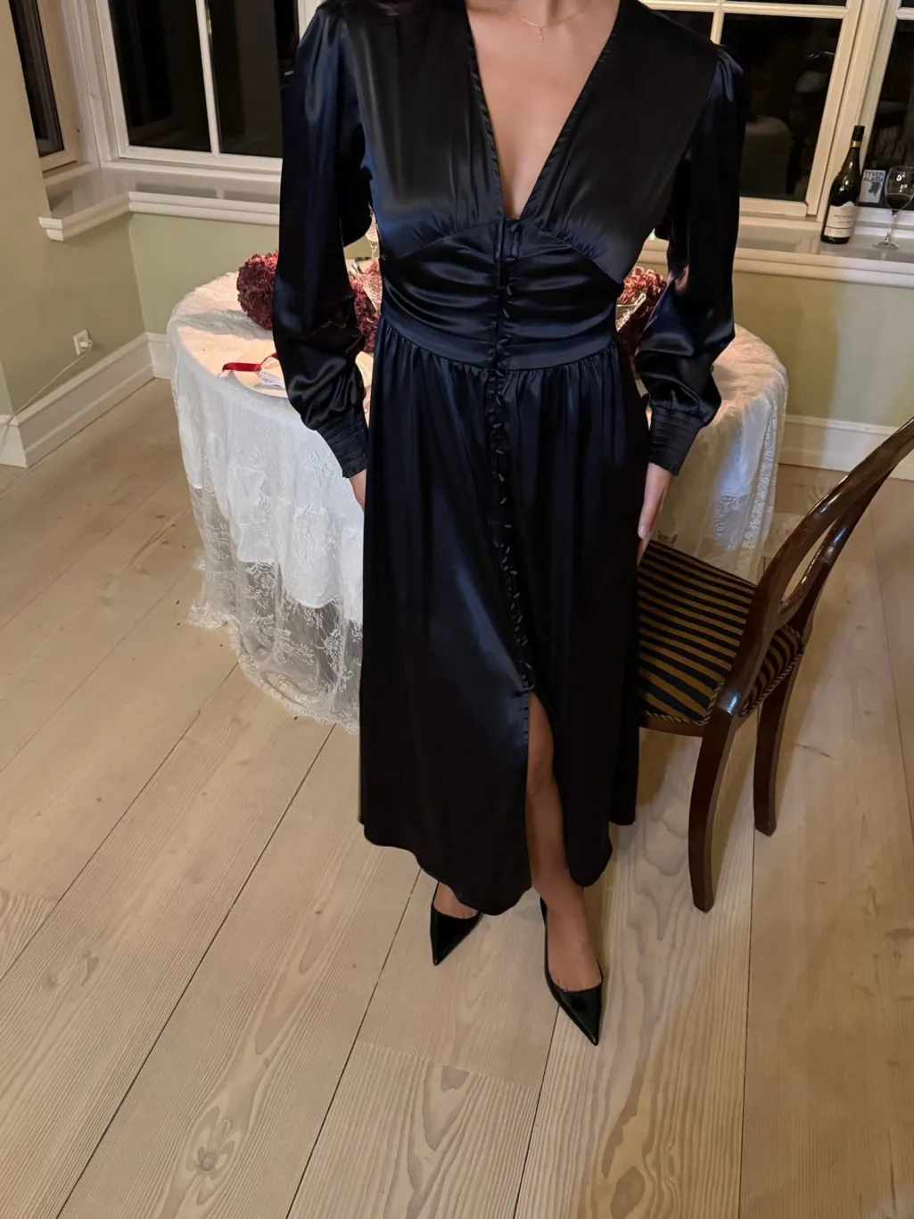Sort satinkjole fra BYIC med skinnende overflade. Kjolen har V-udskæring, knapper langs fronten og markeret talje med rynkedetaljer. De lange ærmer har smockede manchetter med elastik.