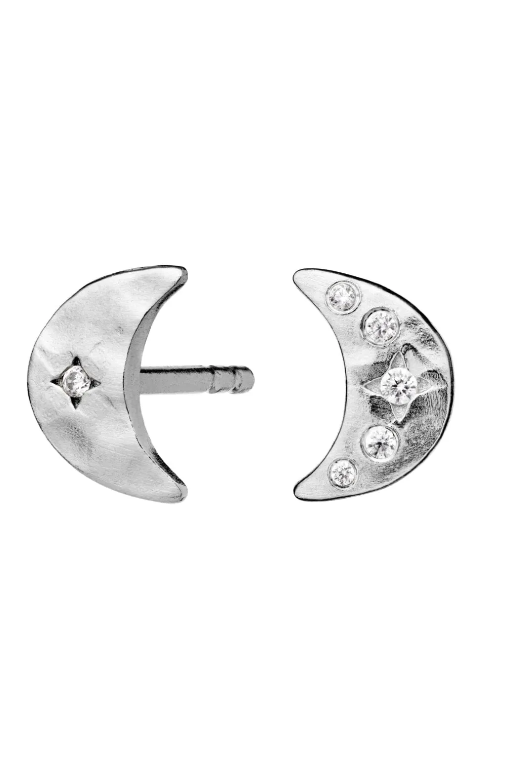 Øresticks fra Maanesten i en halvmåneform med struktureret overflade. Smykkerne er håndlavet i genanvendt sterlingsølv med en mat finish og en detaljeret overflade.