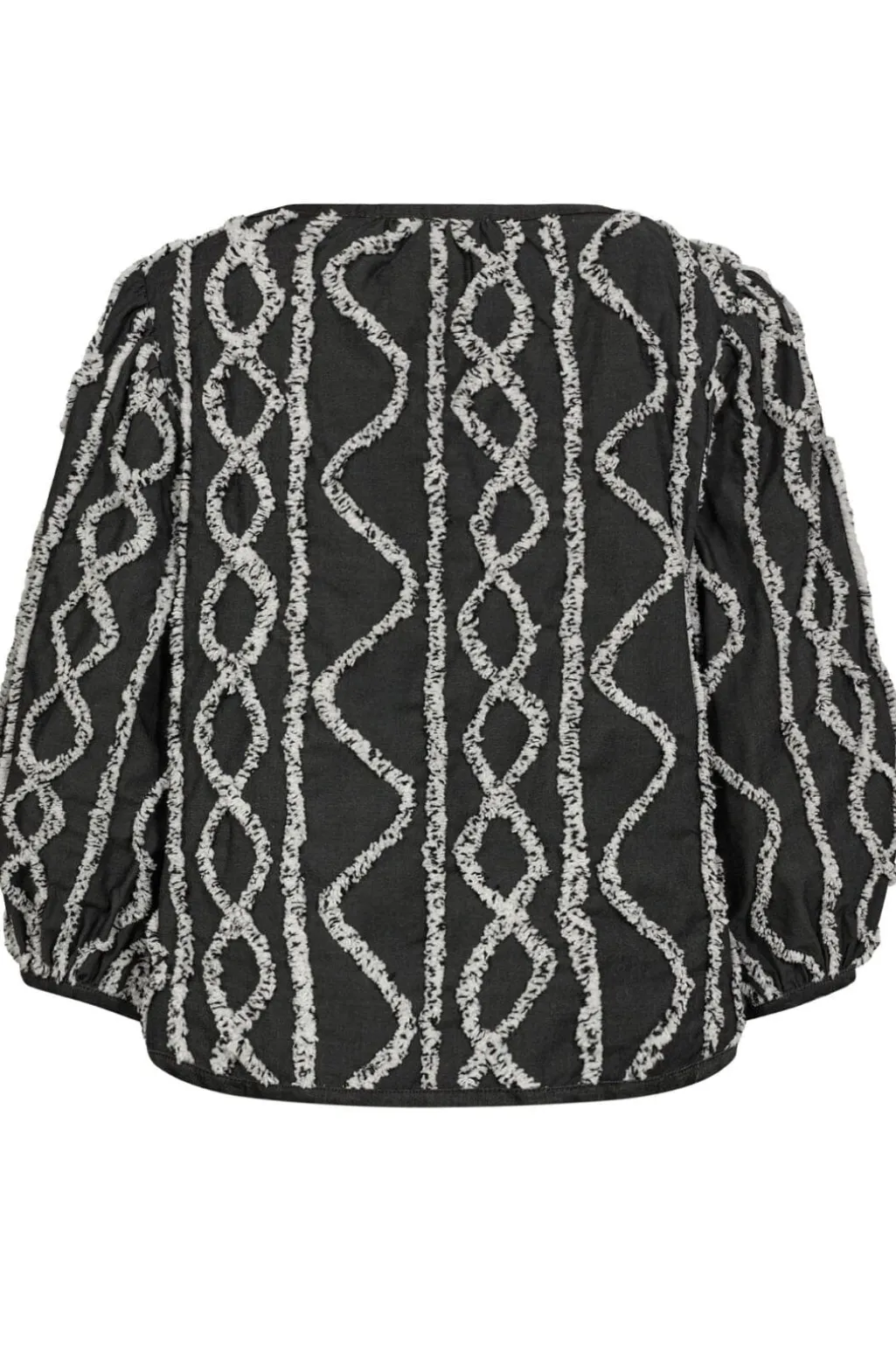 Grå jakke fra Gossia med et slangemønster i lys farve. Jakken har pufærmer og et knyttebånd ved halsen, der giver den et særegent udseende.