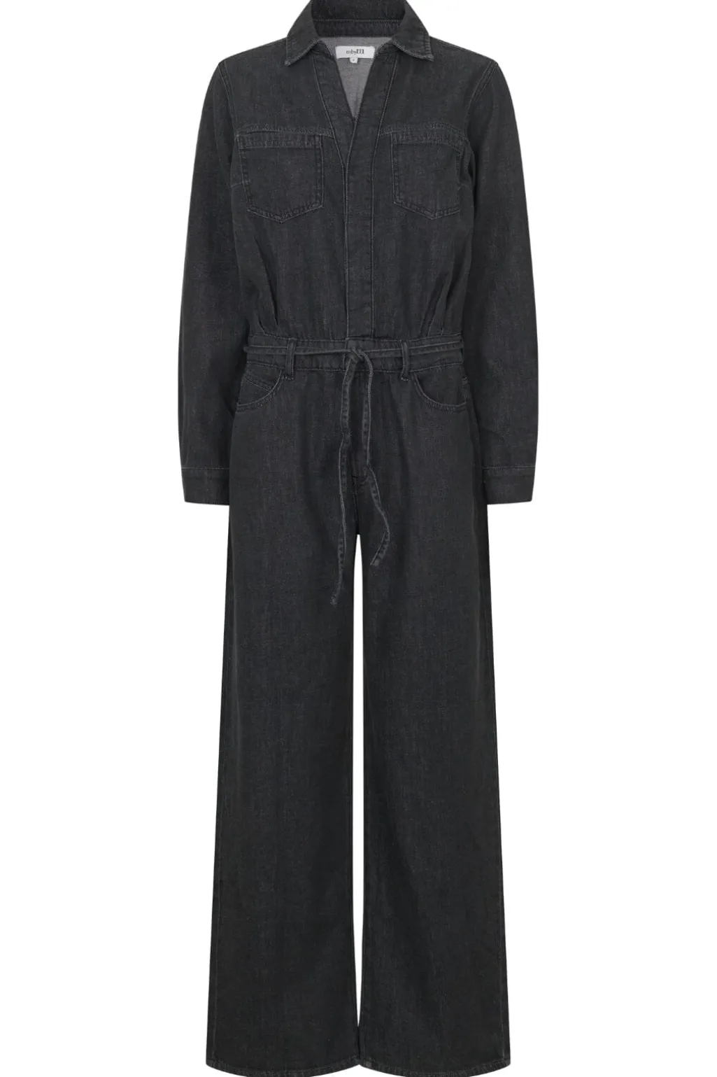 Sortvasket buksedragt fra MbyM med skjortekrave og lange ærmer. Buksedragten har et afslappet udtryk med forlommer og bindebælte i taljen.