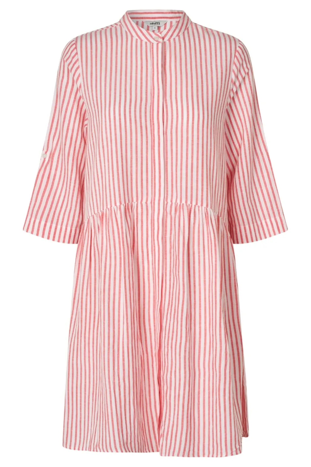 Stribet kjole fra MbyM med skjortekrave og knaplukning foran. Den har en samlet talje og trekvartlange ærmer. Kjolen kommer i koral og hvide striber.