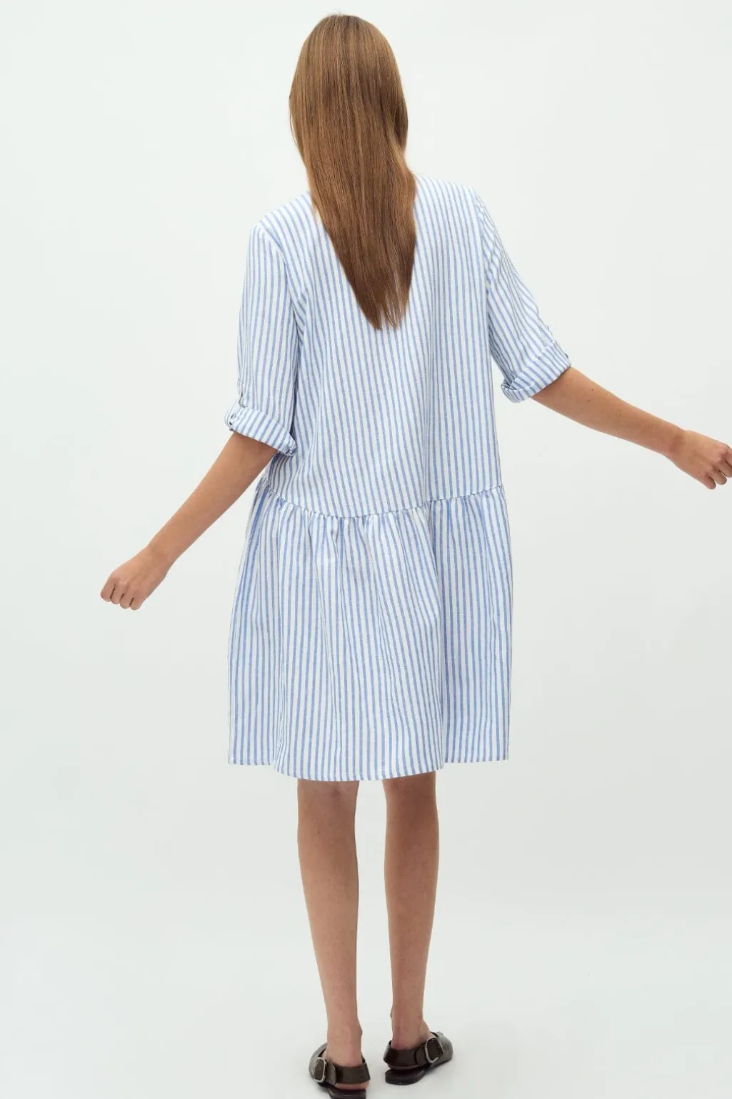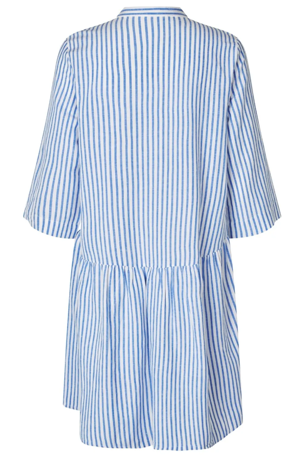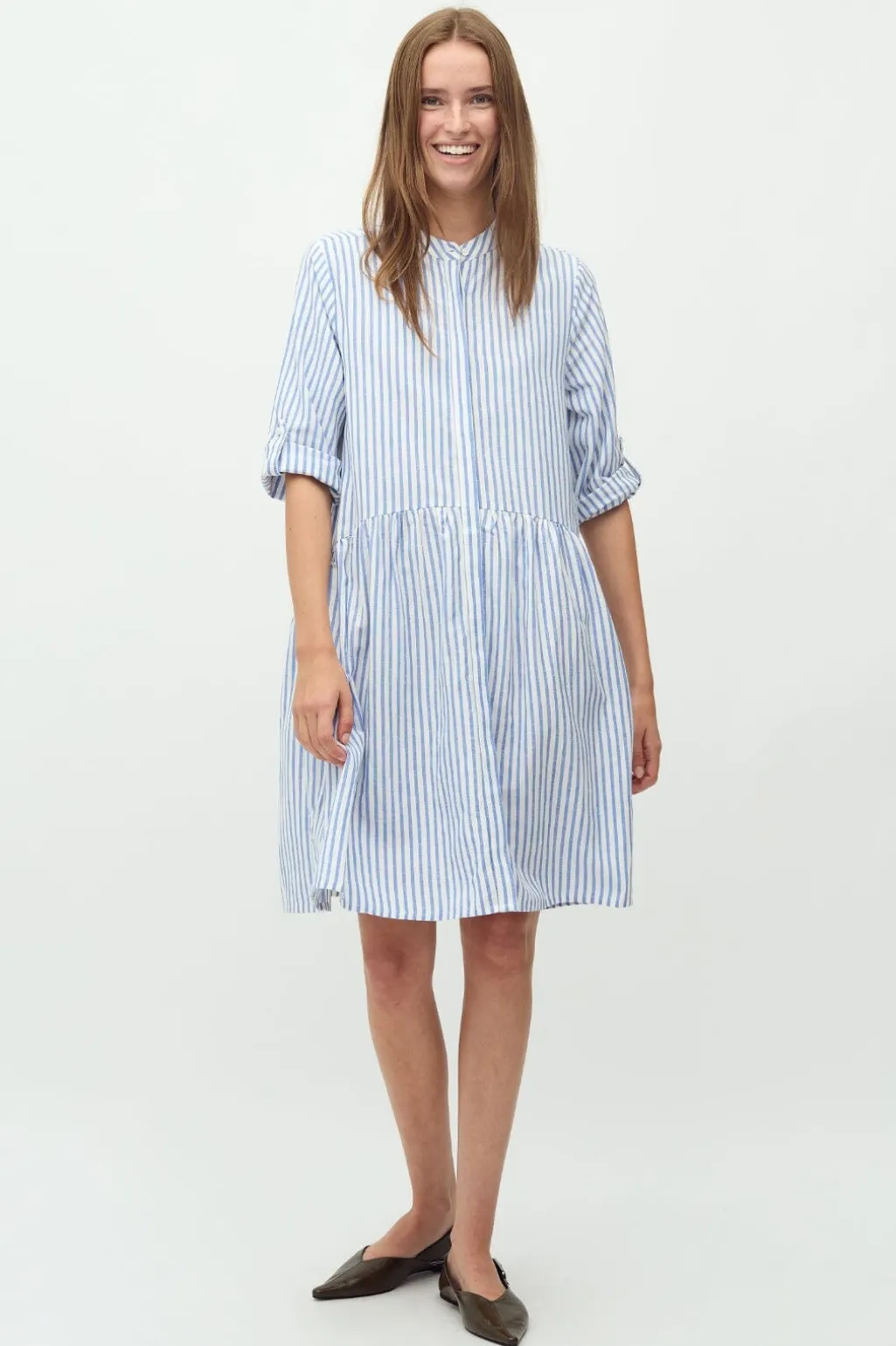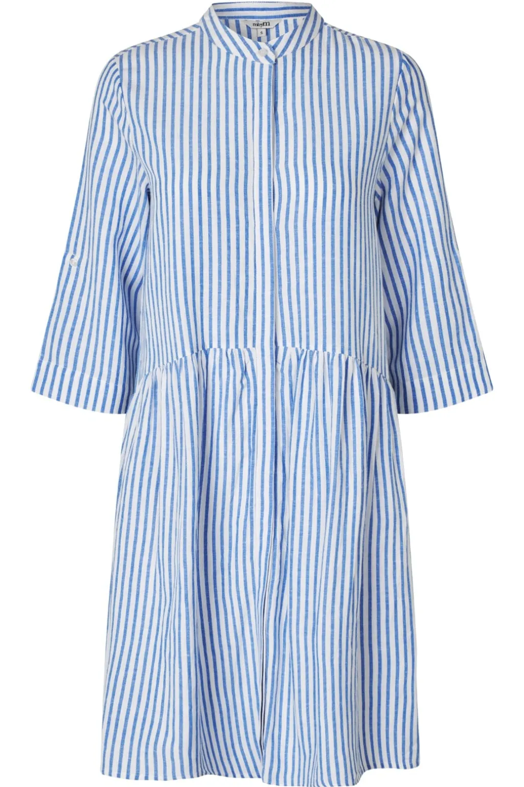 Stribet kjole fra MbyM med skjortekrave og 3/4 ærmer. Kjolen har et maritimt mønster i blå og hvid samt flæsedetaljer, der giver den et feminint udtryk.