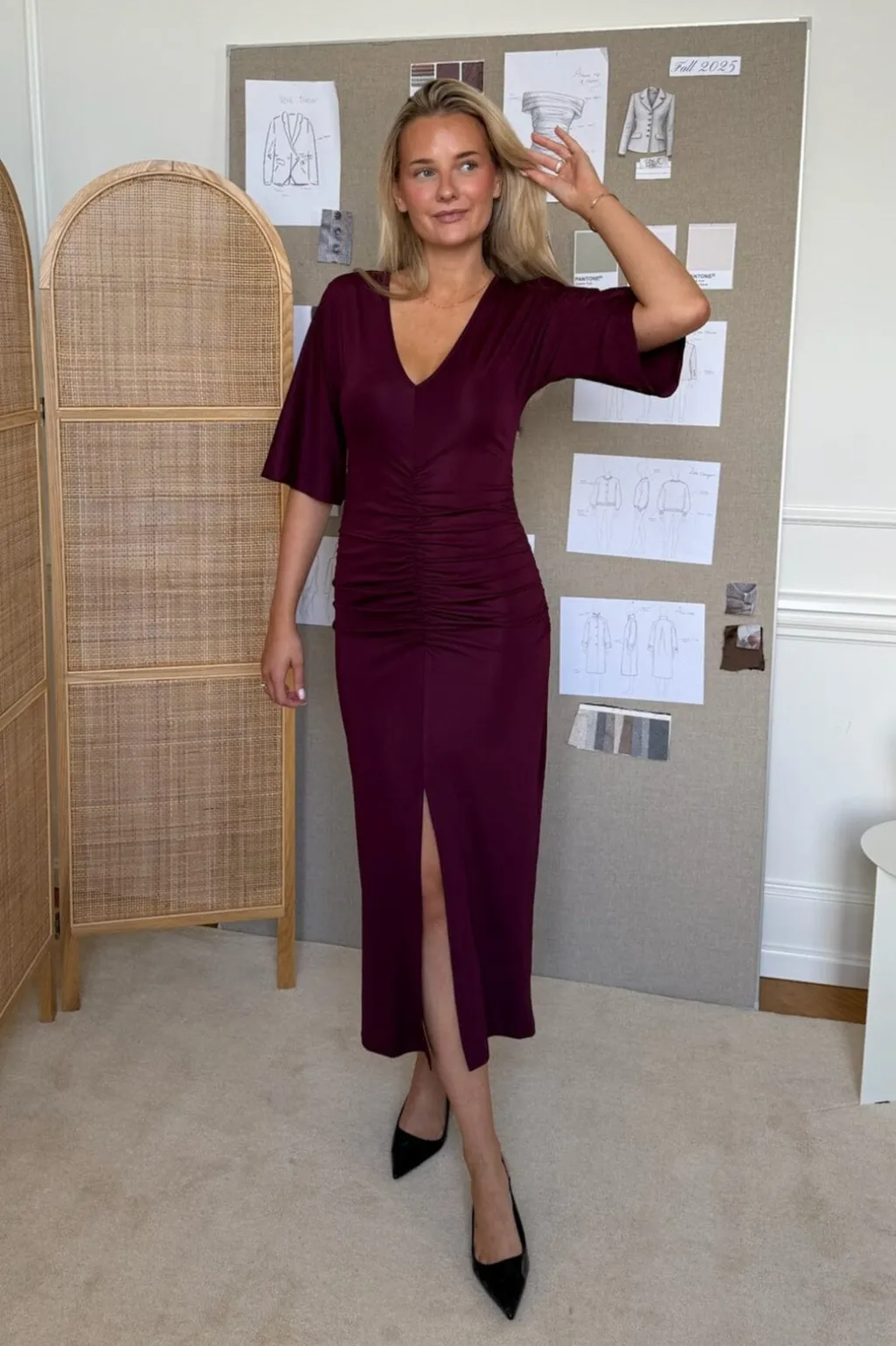 Bordeauxfarvet kjole fra BYIC med V-udskæring og korte ærmer. Kjolen har rynkede detaljer i taljen og en slids foran. Stoffet har en blød og let skinnende overflade.