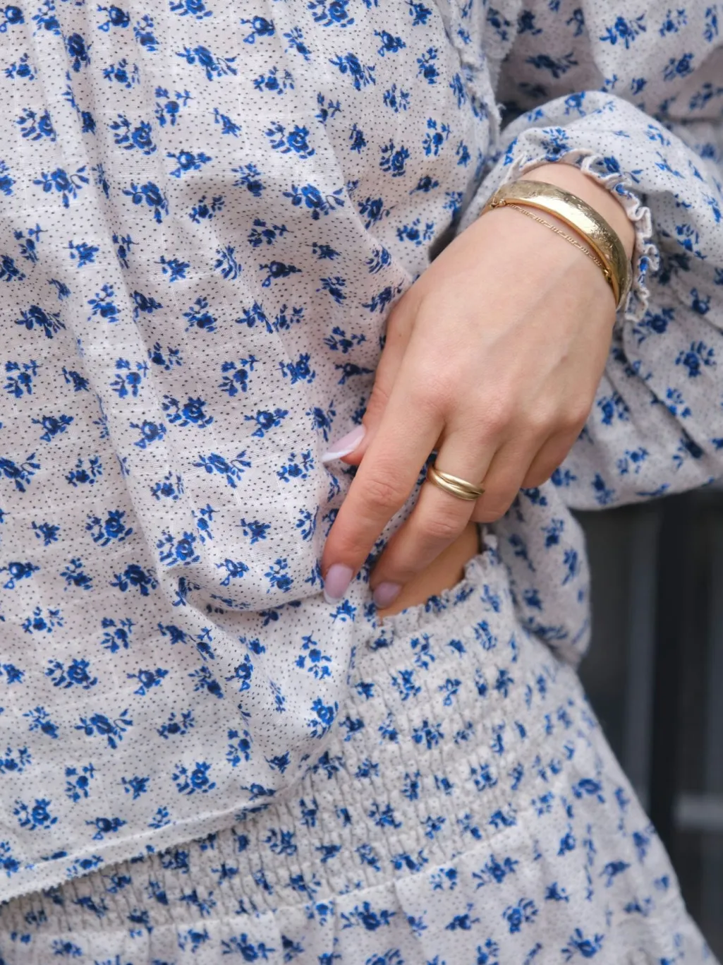 Blå nederdel med blomster- og prikprint. Skørtet har en smock-detalje i taljen og et lag af rynkeeffekter. Det blå og hvide mønster skaber et friskt udtryk.