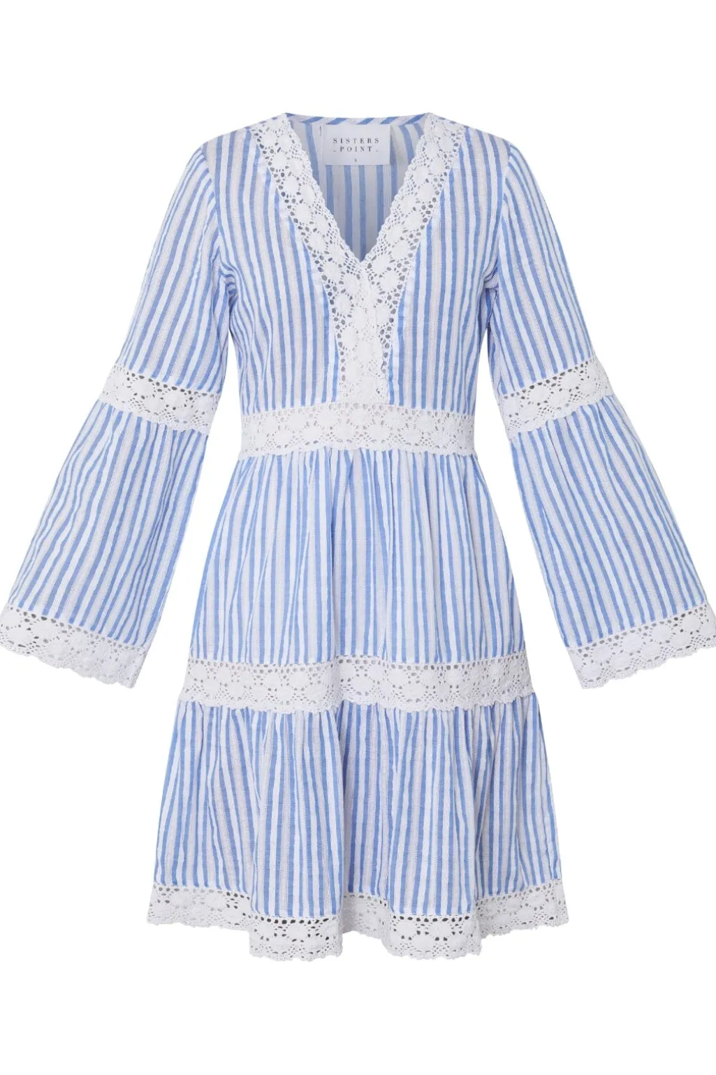 Stribet kjole fra Sisters Point med blå og hvide striber. Kjolen har blondedetaljer ved ærmerne og langs bunden, som giver et maritimt og feminint udtryk.
