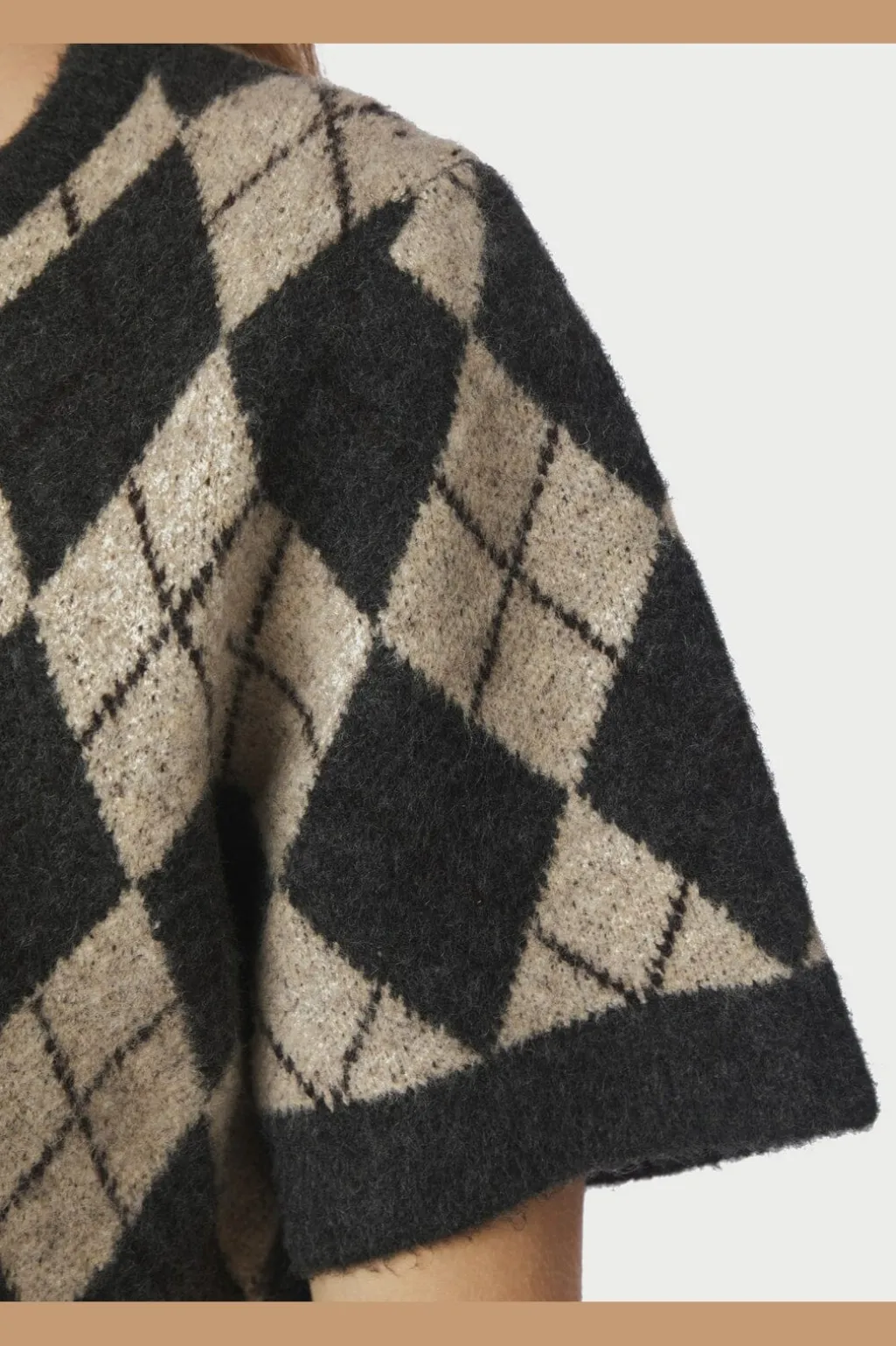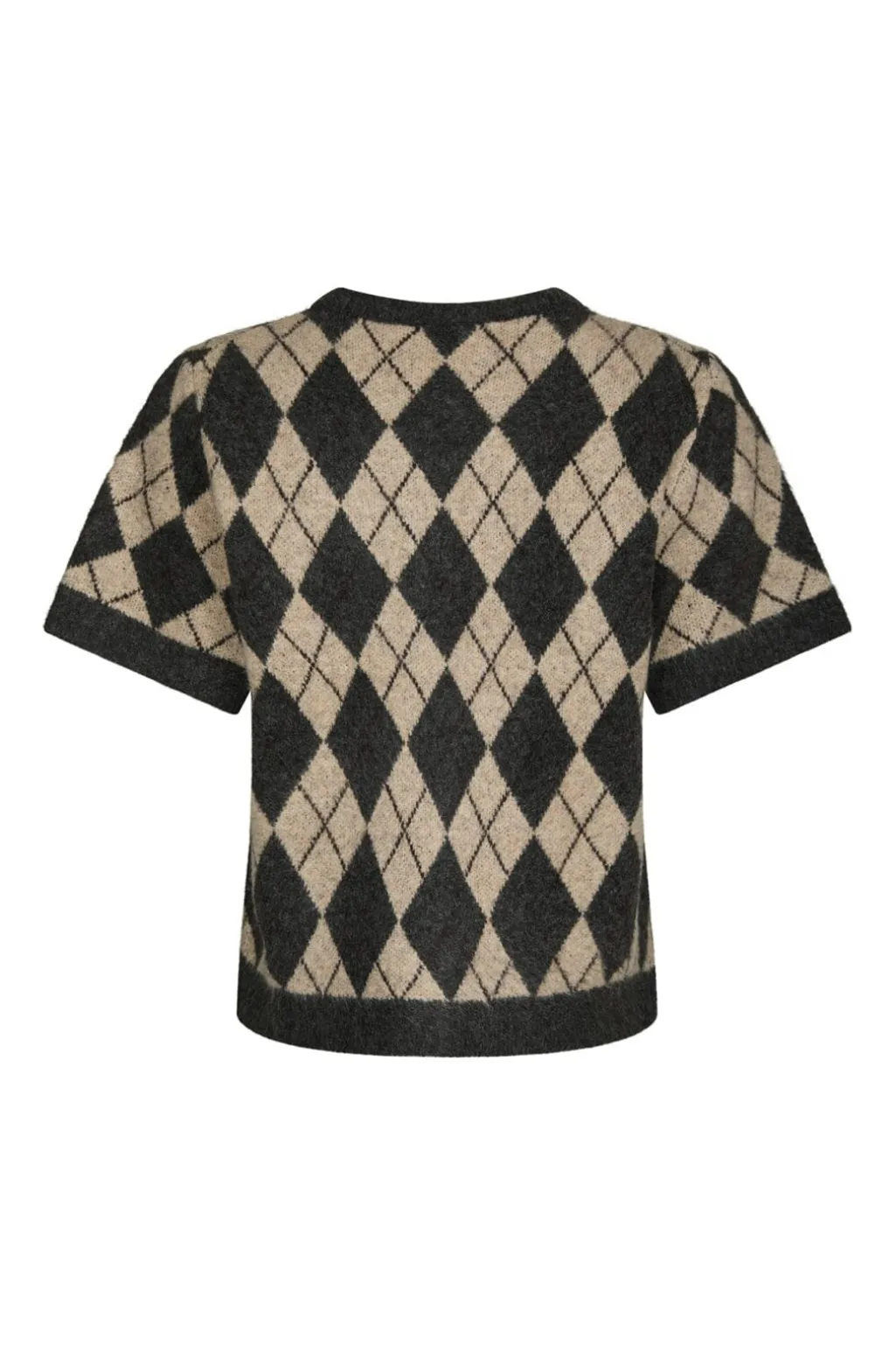 Kortærmet strikcardigan fra Neo Noir med et ternet argyle-mønster i beige og grå. Cardiganen har en rund halsudskæring og knaplukning foran.