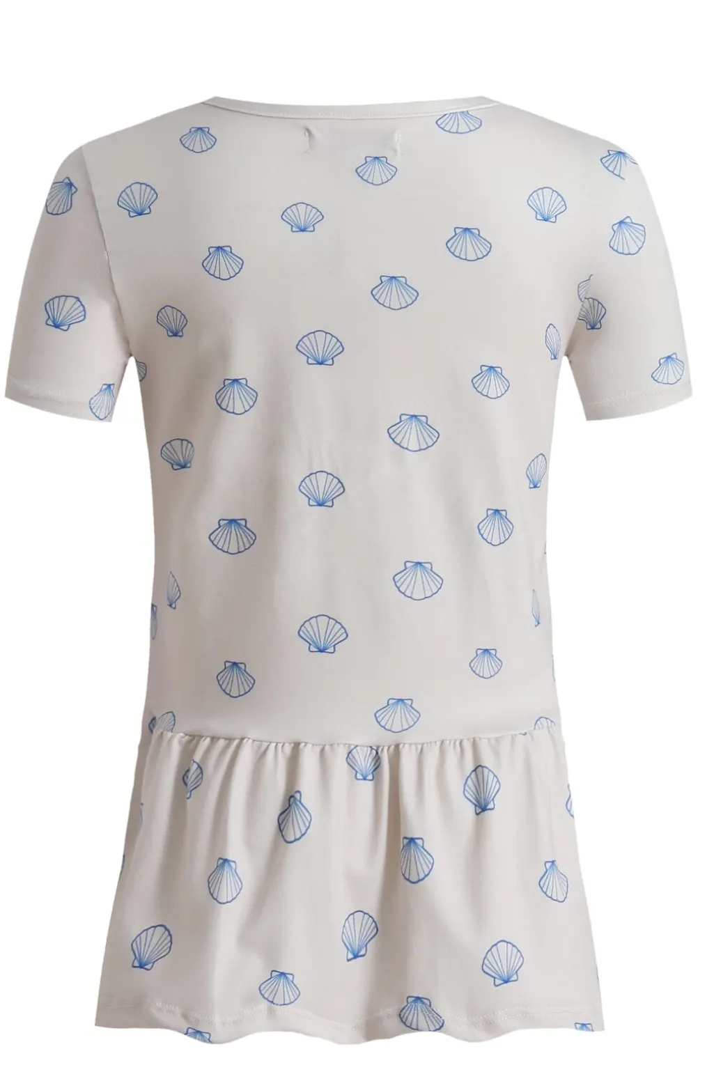 T-shirt fra Liberte Ami med elfenbensfarvet bund og blåt skaldyrsmønster. Den har korte ærmer og en flæsekant i bunden, der giver en sød detalje.
