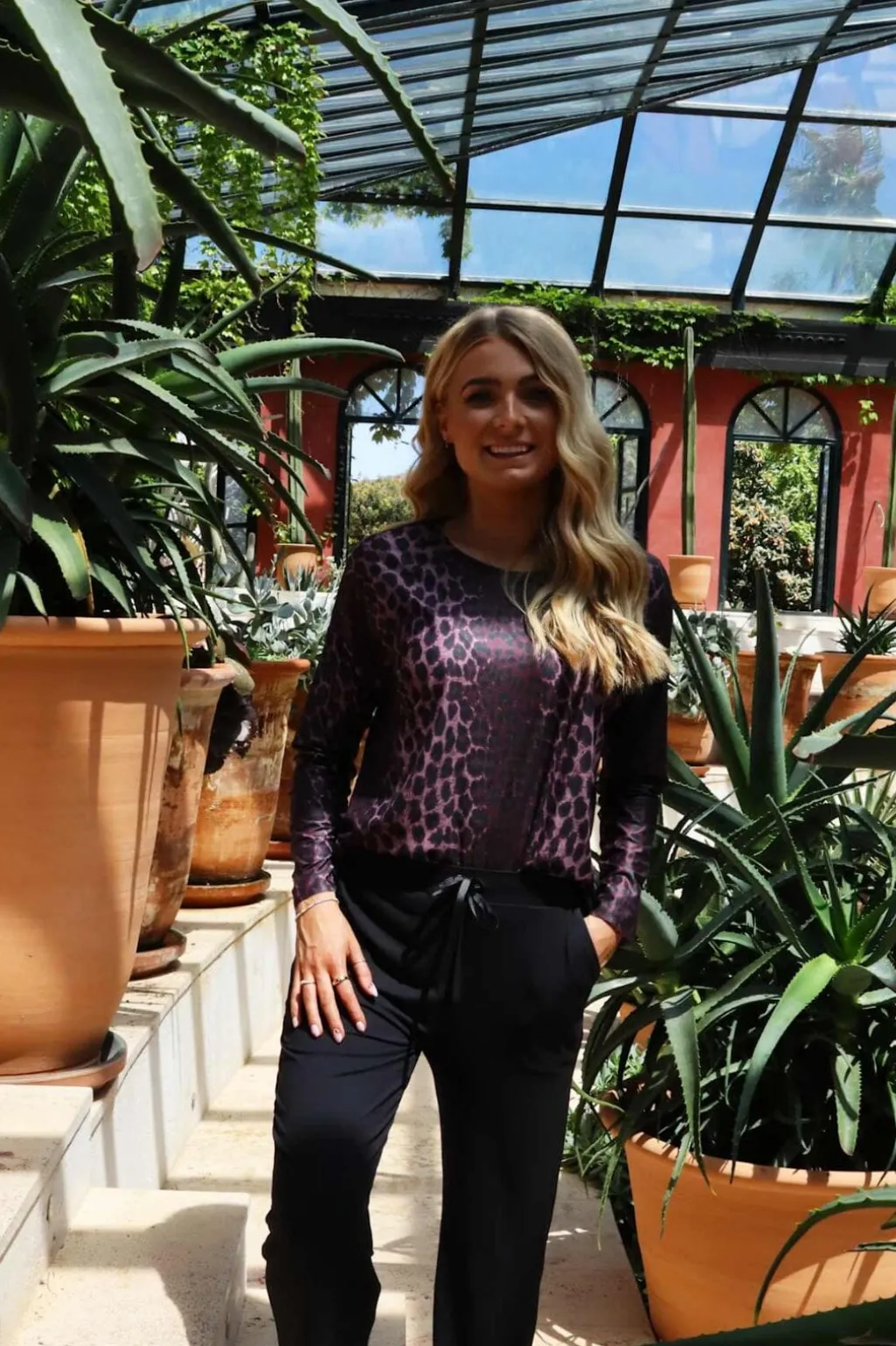 Langærmet top fra Liberte med leopardmønster i bordeaux og pink nuancer. Toppen har en løstsiddende pasform og en rund halsudskæring.