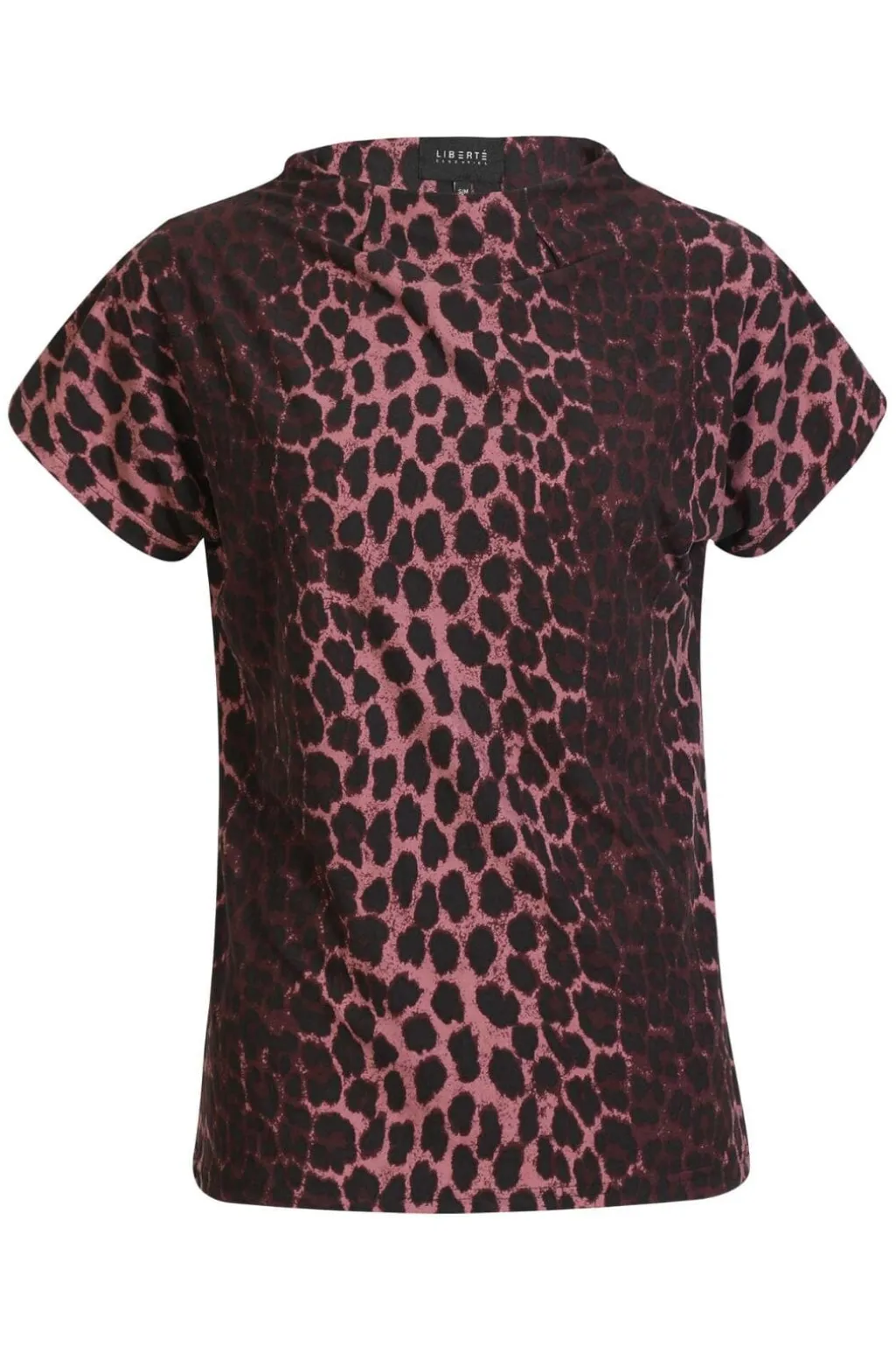 Top fra Liberte med leopardmønster i bordeaux og sort. Toppen har høj hals og korte ærmer.