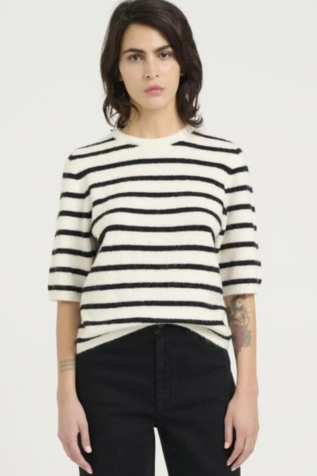 Stribet bluse fra Gestuz med sort-hvide striber. Blusen har 3/4-ærmer og rund hals. Den er lavet af en blanding af naturlige og strækbare materialer.