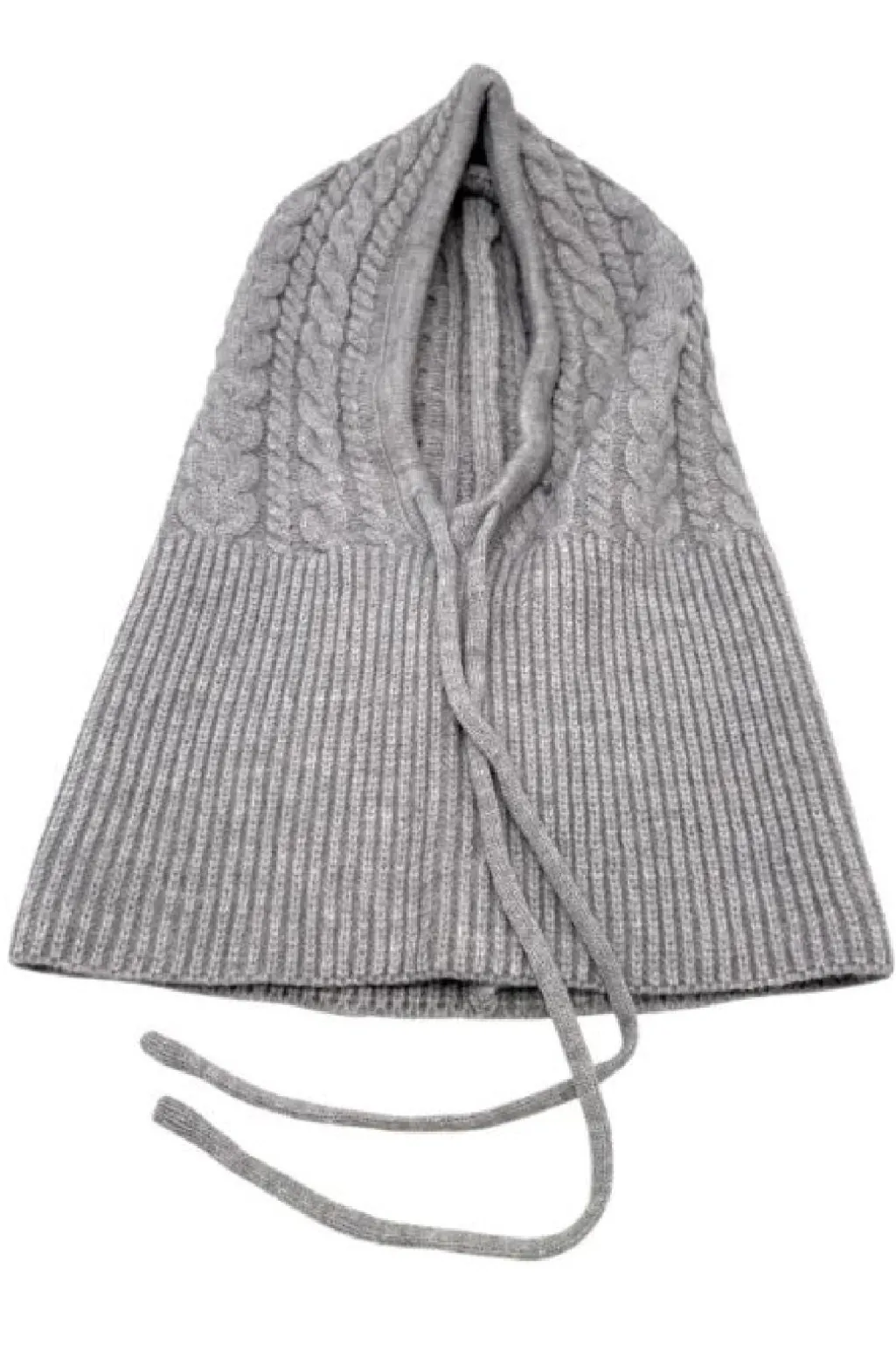 En lysegrå balaclava fra A-bee, lavet af en blanding af akryl og uld. Den har et strikket mønster med flettet kabelstrik øverst.