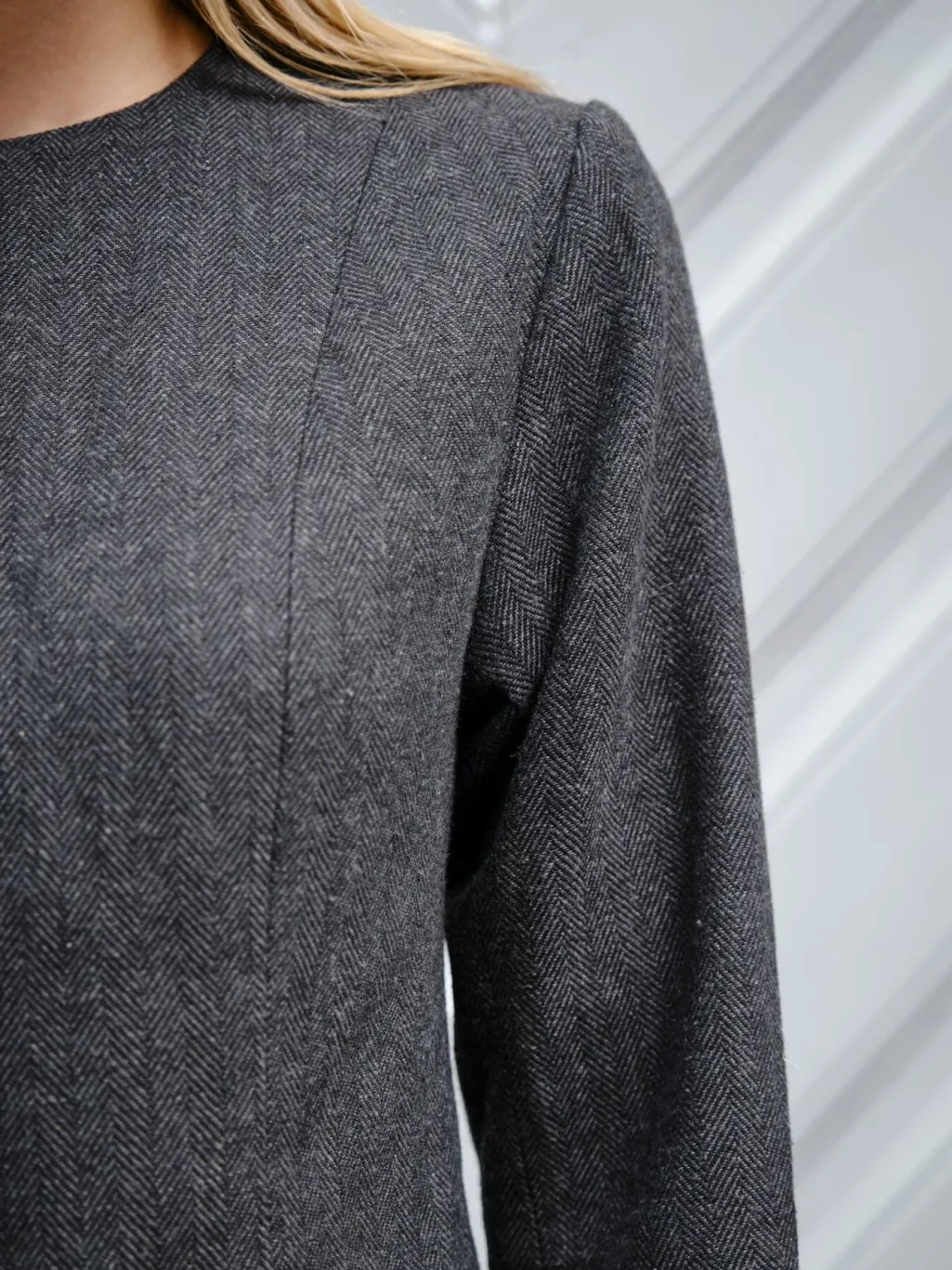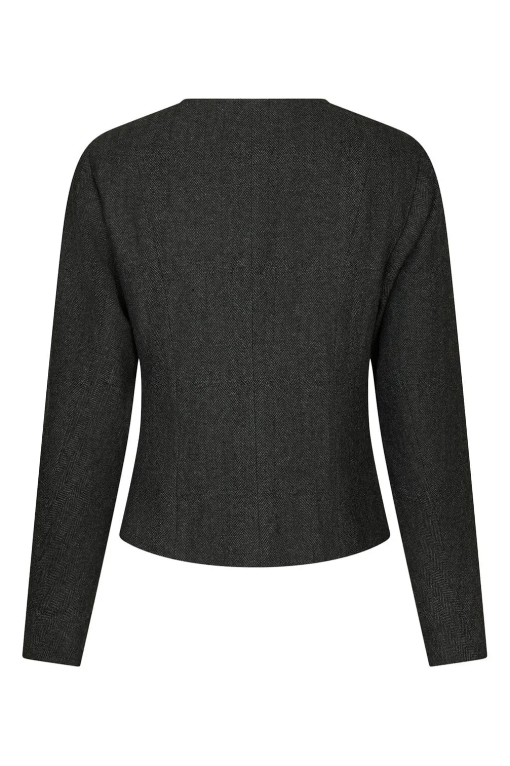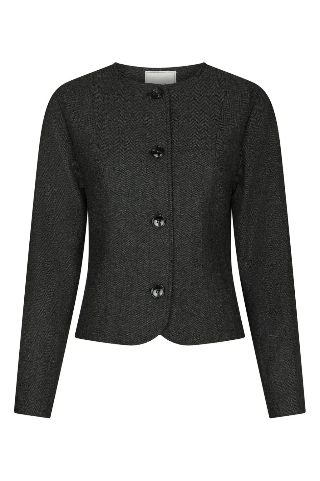 Antracitfarvet jakke fra Neo Noir med herringbone-mønster. Jakken har en fitted pasform med buede ærmer og knaplukning foran.