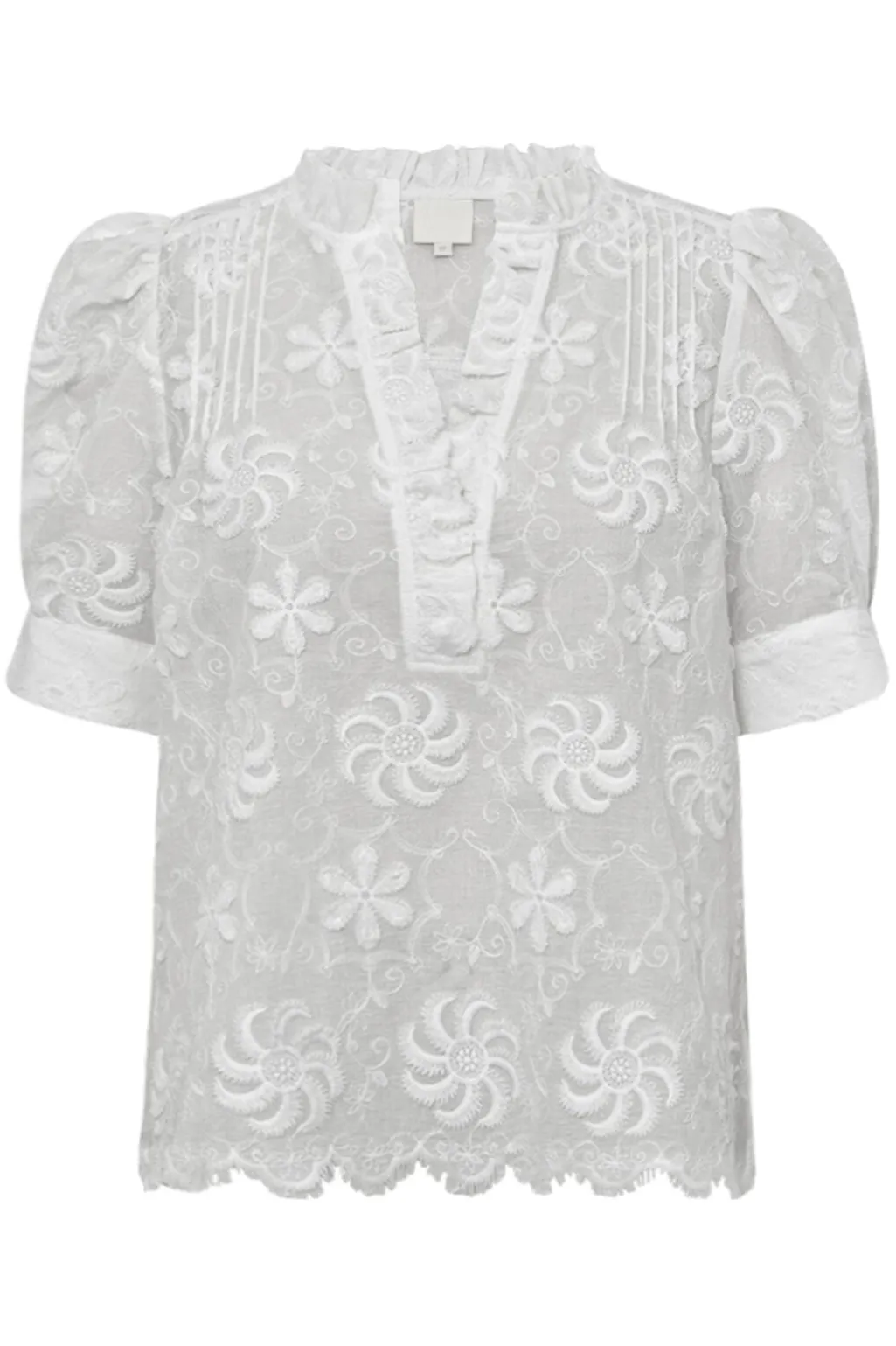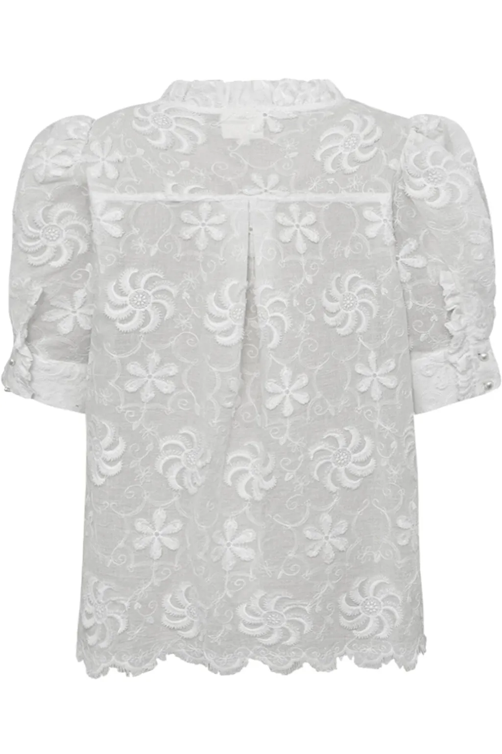 Hvid bluse fra Gossia med broderede blomstermønstre og blondedetaljer. Blusen har pufærmer og en rynket v-halsudskæring med flæsekant.
