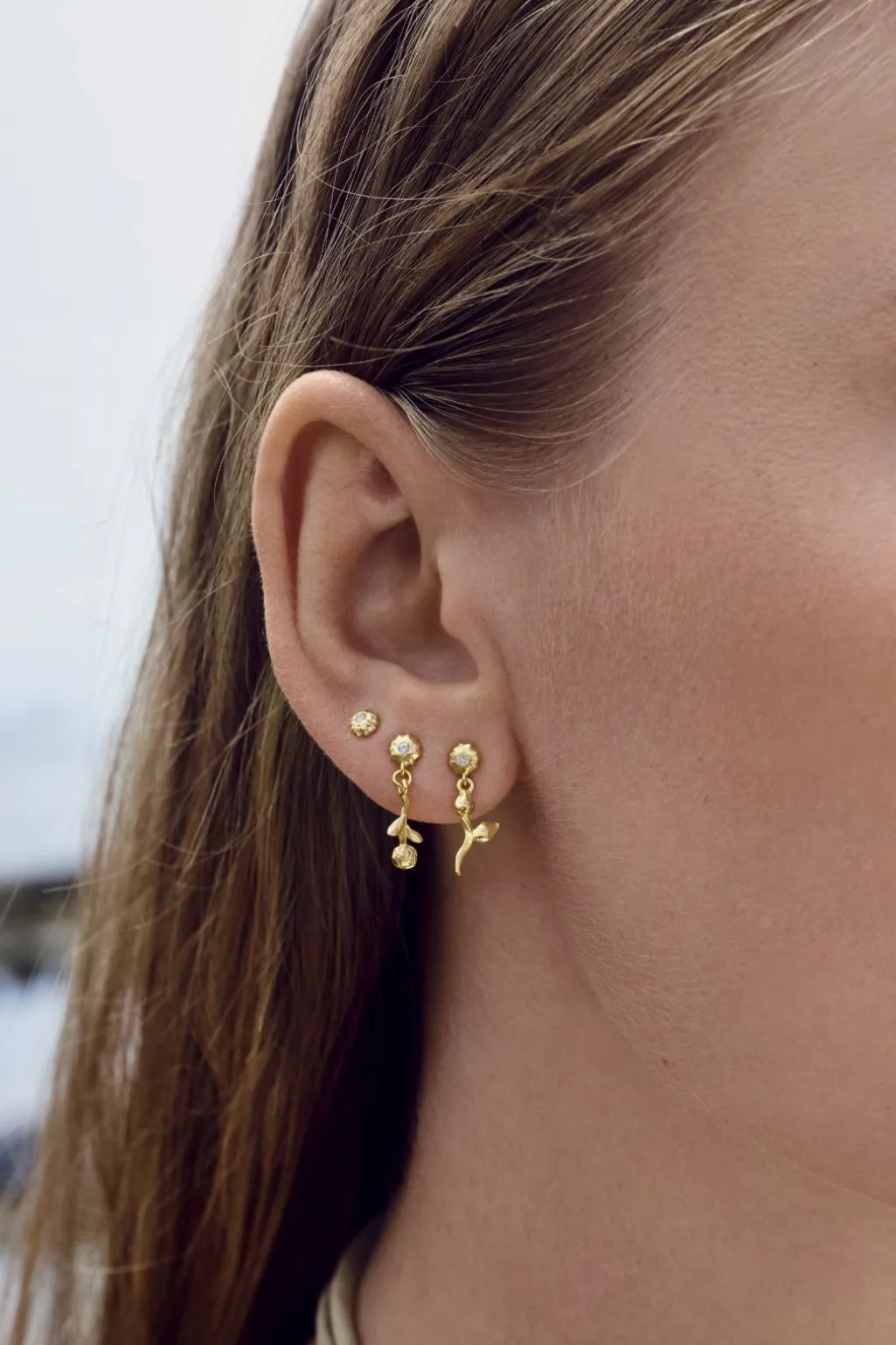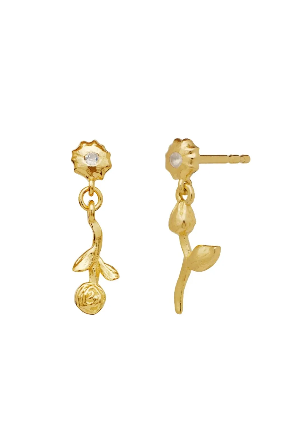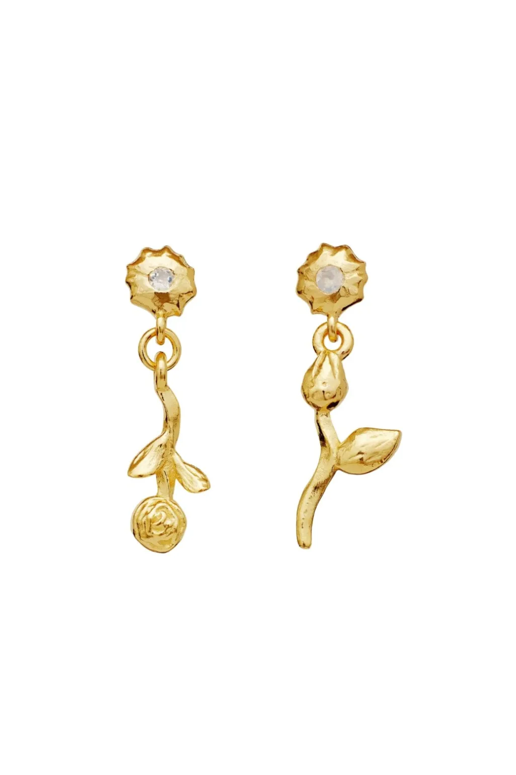Øreringe fra Maanesten med regnbue-månesten og blomsterformet design. Den centrale sten har et naturligt farvespil, og designet består af en blomsterstud med hængende rosenknop.