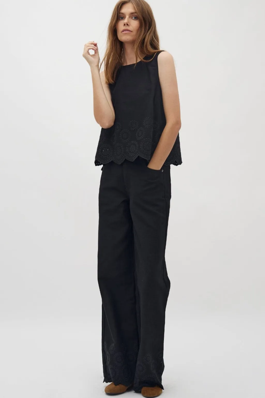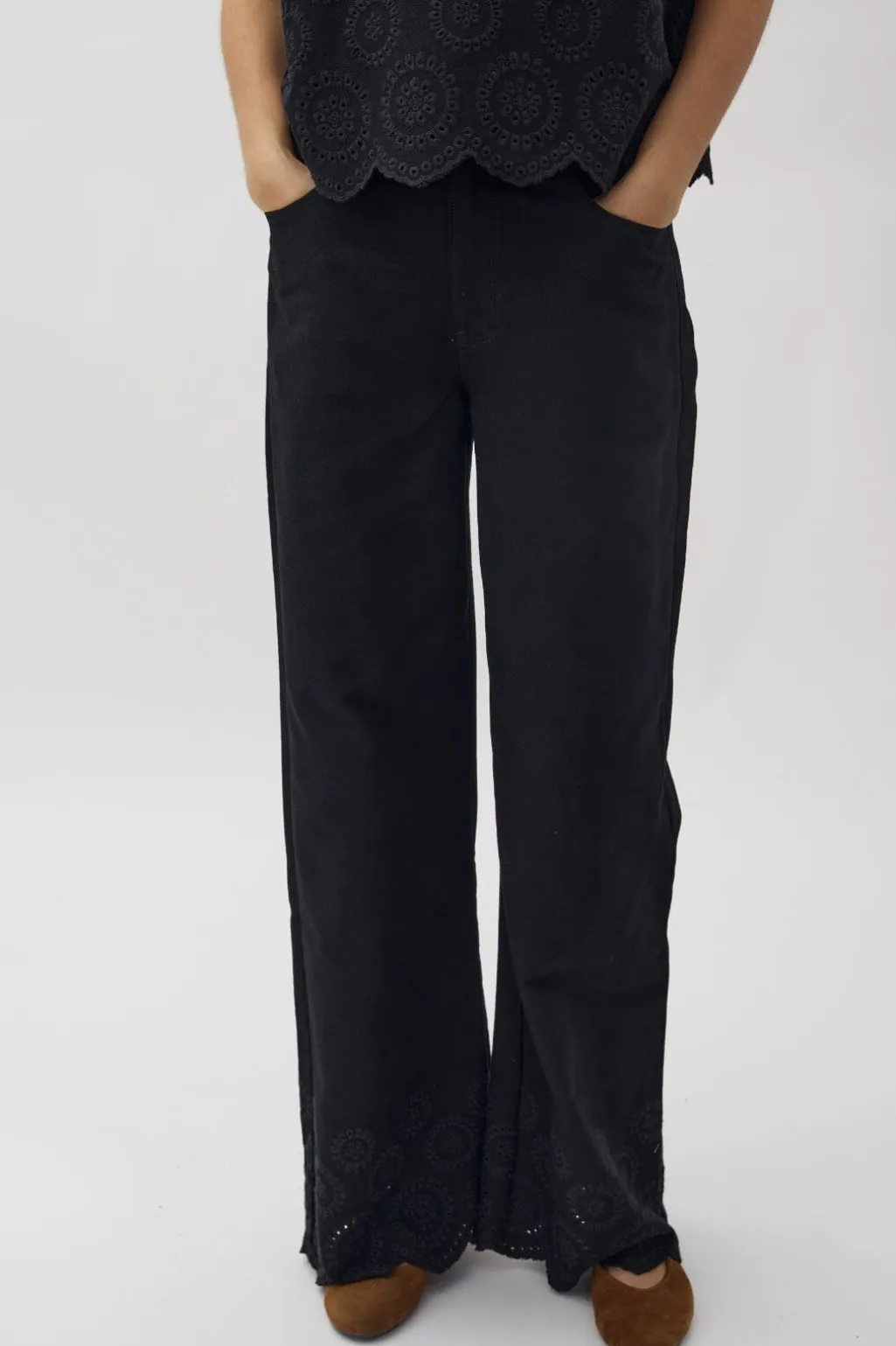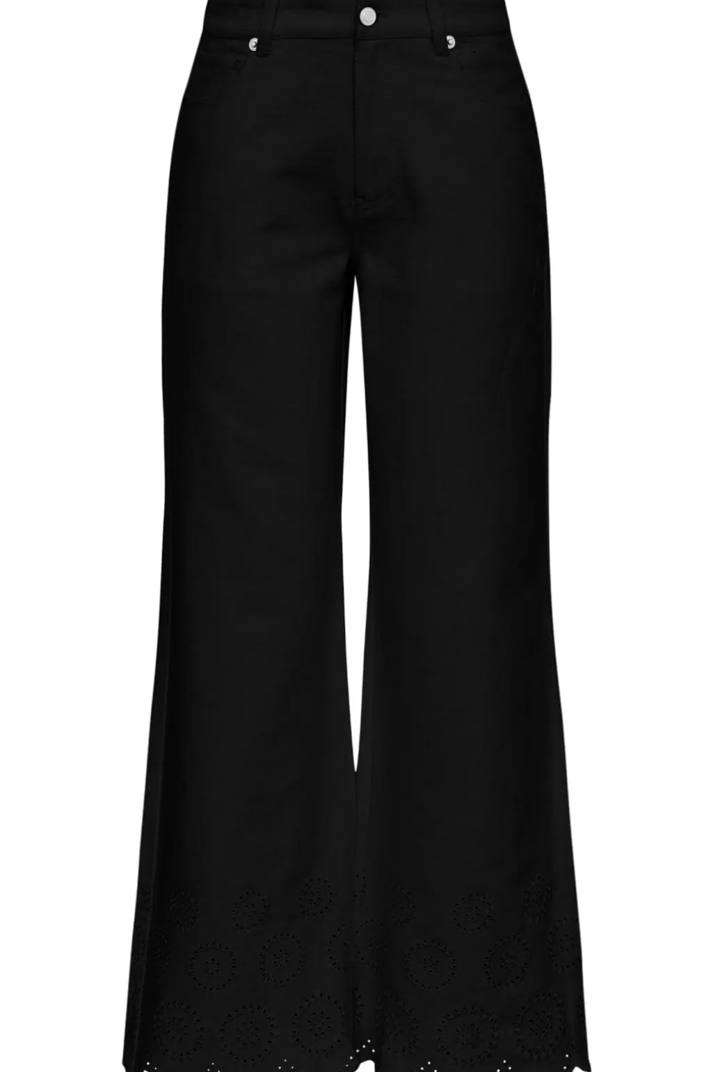 Sorte jeans fra Global Funk med bred benkant og broderede blomstermønstre. Bukserne har en høj talje og en scallop-kant med udskårne detaljer langs bunden.