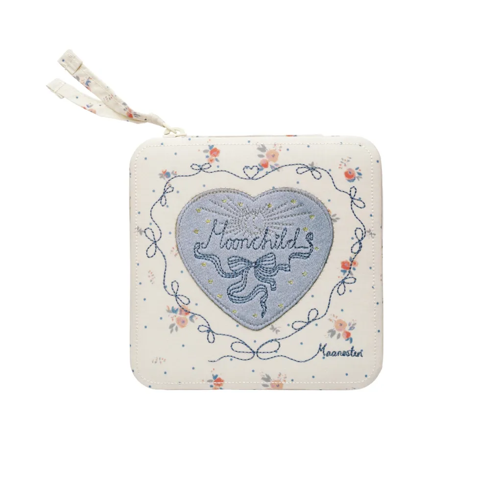 Lyseblåt smykkeskrin fra Maanesten med broderet hjerte på forsiden. Skrinet har en hvid base med små blomstermotiver og blå sløjfedetaljer langs kanten.