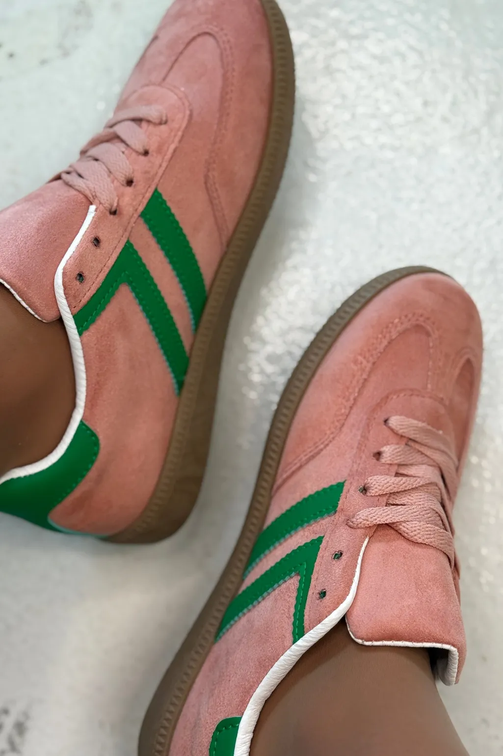 Lyserøde sneakers fra Bloom, lavet af syntetisk materiale. Skoene har grønne detaljer på siden og en brun sål, der giver dem et farverigt udtryk.
