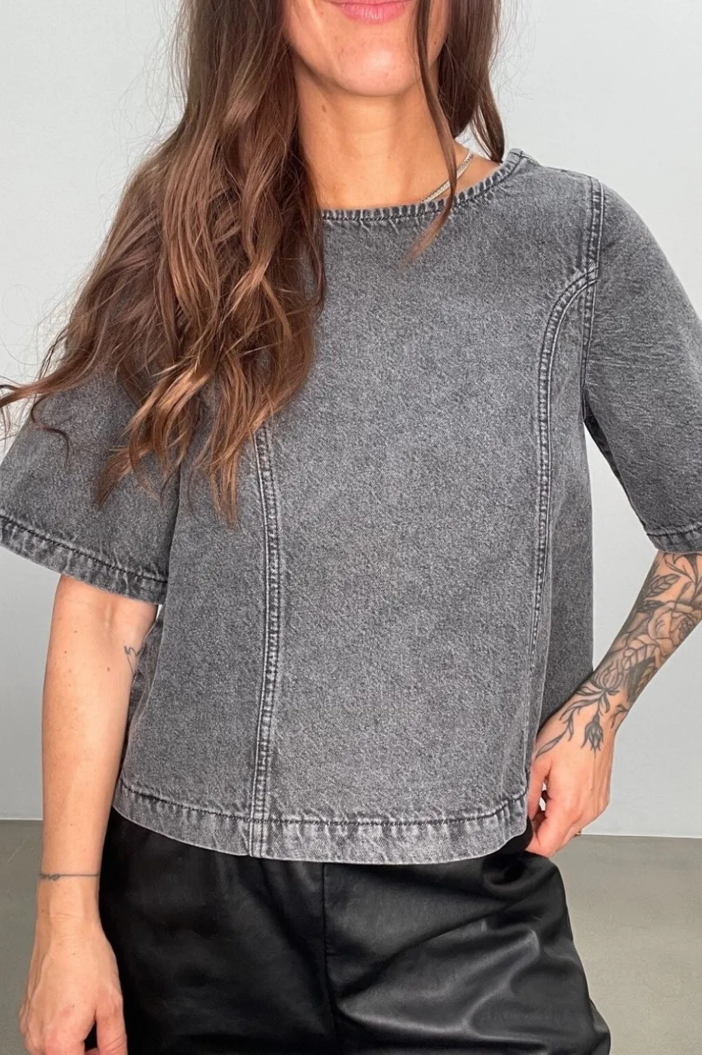 Grå t-shirt fra Global Funk med acid wash-effekt. De dekorative syninger og den runde halsudskæring giver t-shirten et rent og enkelt udtryk.