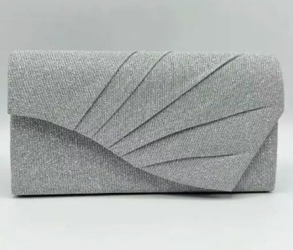 En clutchtaske fra Anobel Copenhagen i sølv. Tasken har en glitrende overflade og et rektangulært design med foldedetaljer på fronten.