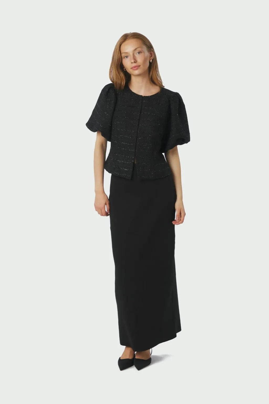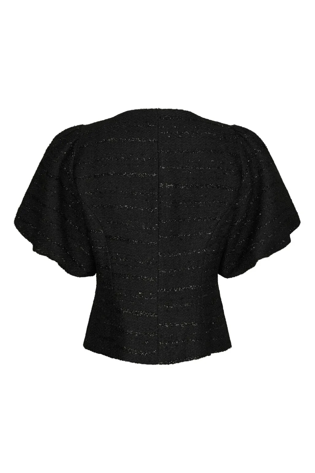 Sort bluse fra Neo Noir i boucle-stof med glimmereffekt i de vandrette striber. Blusen har pufærmer og knaplukning foran samt en kropsnær pasform ved taljen.