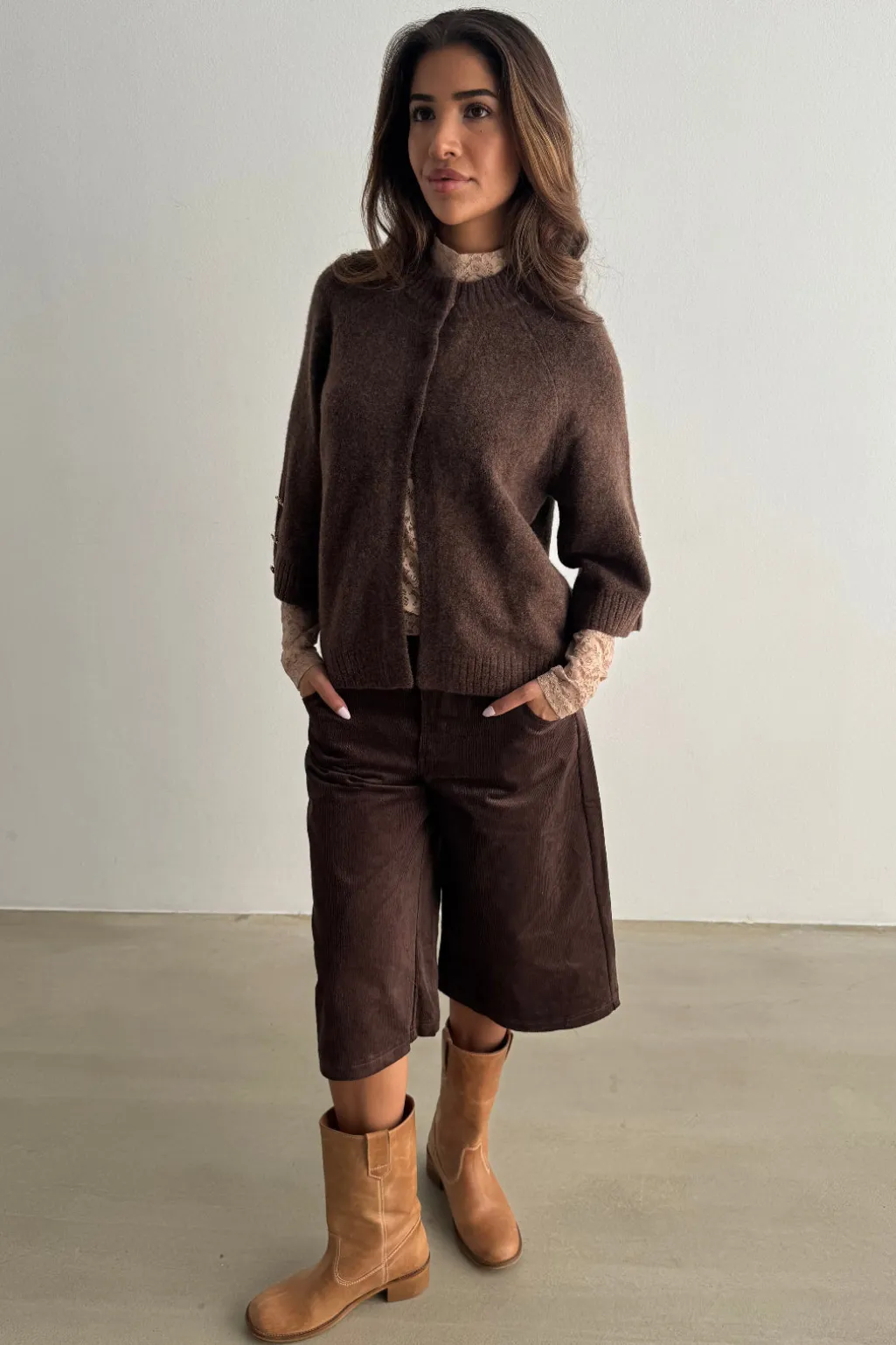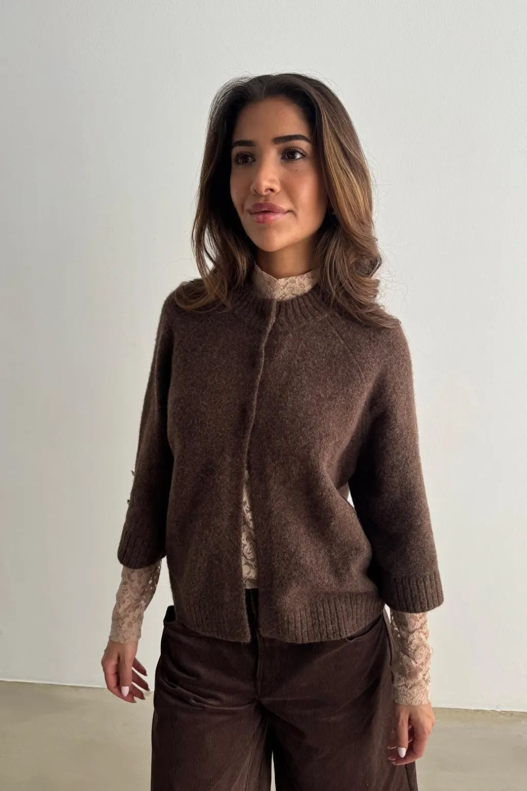 Brun strikbluse fra Continue med rund halsudskæring og 3/4 ærmer. Blusen har en regular fit og er strikket i en blød materialeblanding, der gør den varm og behagelig at have på.