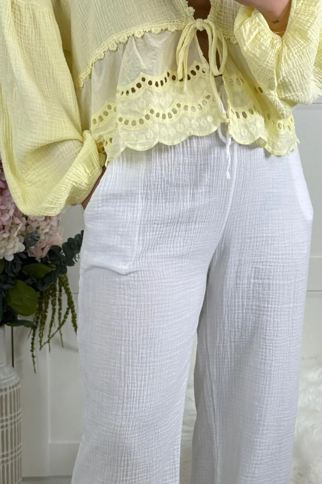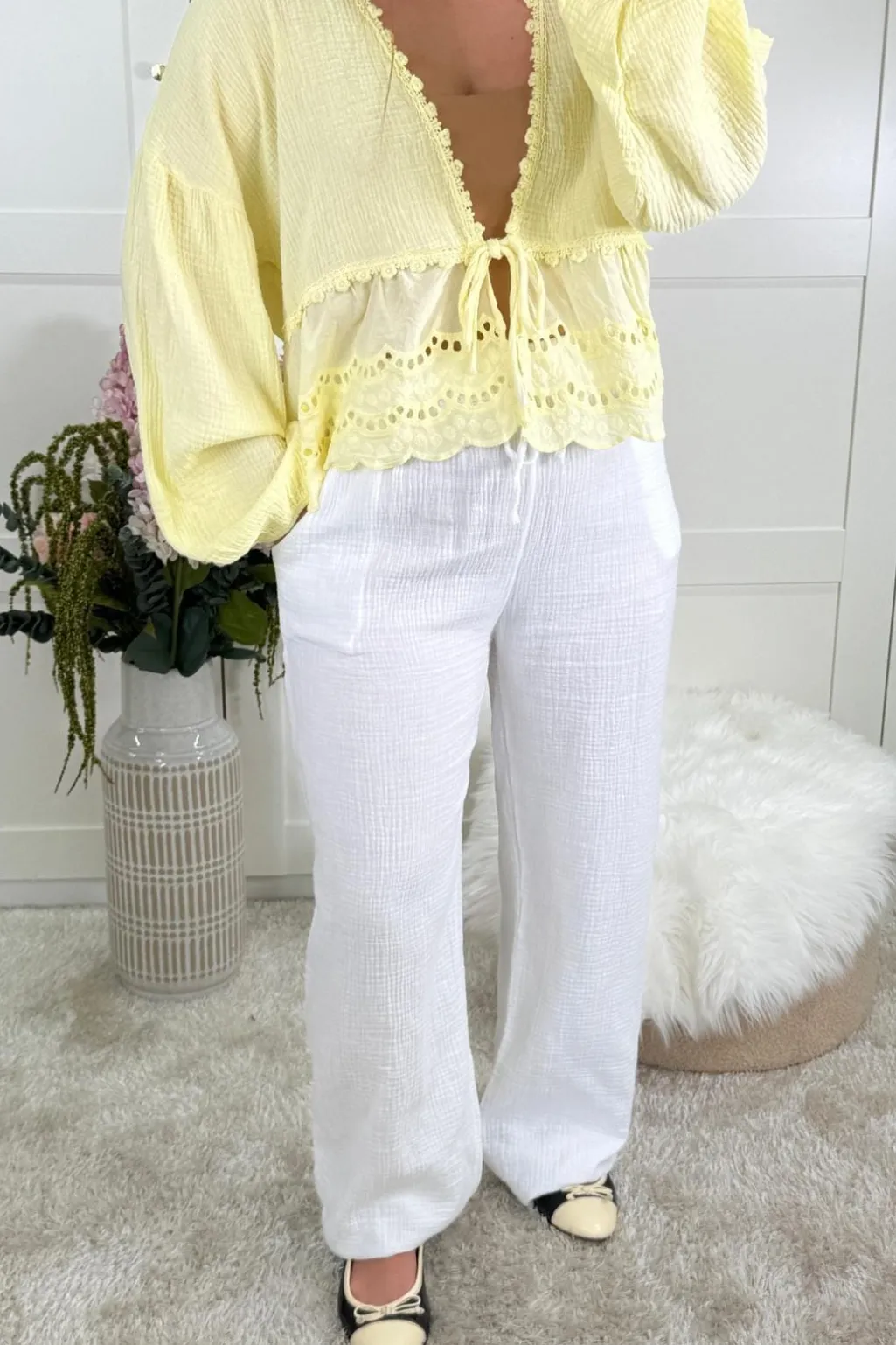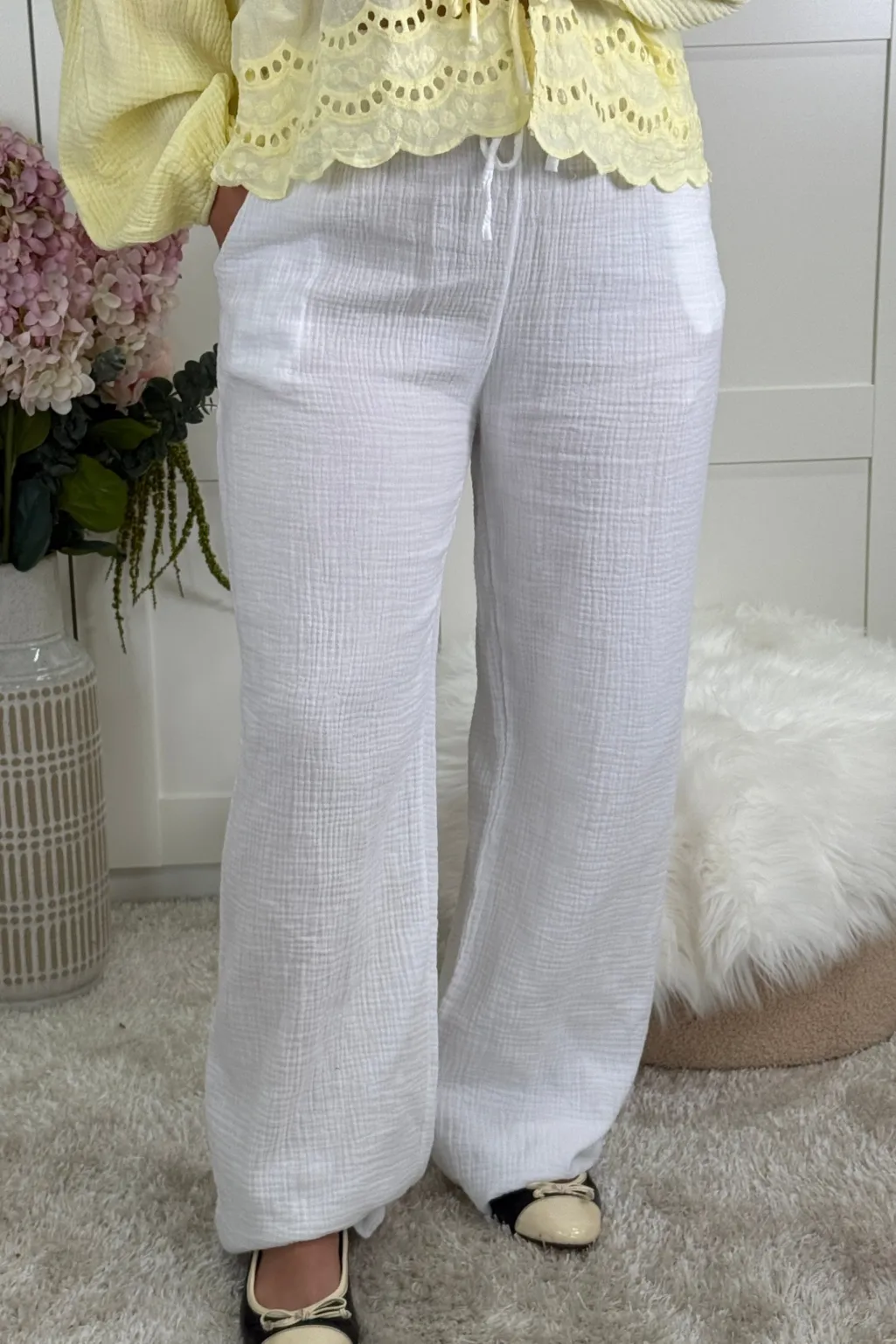Hvide bukser fra A-bee i ren bomuld. De løstsiddende bukser har praktiske lommer og en behagelig pasform, der gør dem nemme at style til forskellige anledninger.